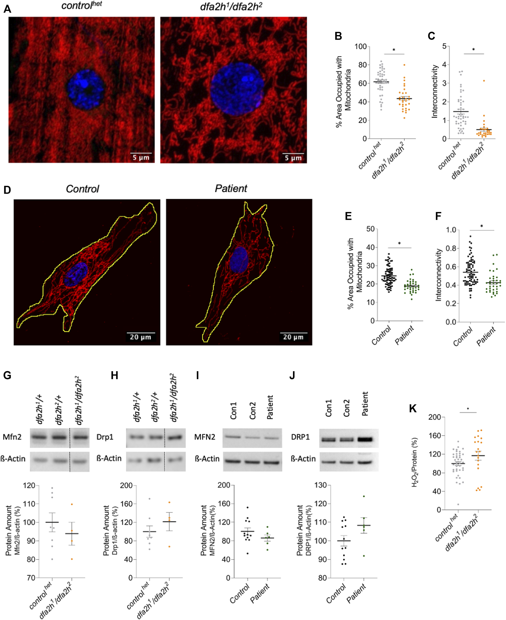 Immunolabeling reveals mitochondrial changes upon loss of FA2H. (A–C) Larval muscle sections labeled with mitochondrial marker ATP5a. (A) Confocal microscopy images show mitochondrial alteration in loss of dfa2h larval muscle sections. The red signal shows ATP5a labeling visualizing mitochondria, and the blue fluorescence DAPI labeling to visualize the nucleus. (B)dfa2h mutant flies present with less area covered with mitochondria compared to controlhet and (C) reduced interconnectivity calculated by area/perimeter ratio. The dots represent single data points, and the lines show mean ± SEM (n = 25–46). (D–F) Immunolabeling patient-derived fibroblasts using mitochondrial marker GRP75. (D) Confocal microscopy images reveal mitochondria alteration. The red signal shows GRP75 labeling visualizing mitochondria, and the blue labeling DAPI labeling to visualize the nucleus. (E) Patient-derived fibroblasts present with a lower percentage of area covered with mitochondria and (F) reduced interconnectivity calculated by area/perimeter ratio. Dots represent single data points, and the lines show mean ± SEM (n = 36–79). For pairwise comparison, Mann-Whitney-U-Test was performed. All pairwise tests, with p < 0.05, were indicated with asterisks in the figure. (G–J) Western blot analysis to detect alterations of mitochondrial dynamics. (G) Compound heterozygous dfa2h1/dfa2h2 flies present with decreased Mfn2 expression levels, which is consistent with the findings in (H) fibroblasts observing MFN2 levels. (I) DRP1 expression levels were increased in loss of dfa2h flies and (J) in patient-derived fibroblasts. The expression levels were normalized to ß-Actin expression. The dots represent single data points as percentages, with the controls set to 100%. The lines show mean ± SEM (nflies = 4–8; nfibroblasts = 6–12). (K) H2O2 levels in compound heterozygous dfa2h1/dfa2h2 flies are increased compared to controlhet flies. The dots represent single data points as percentages, with the controlhet set to 100%. The lines show mean ± SEM (n = 20–40). For pairwise comparison, Mann-Whitney-U-Test was performed. The asterisk in the figure indicates the pairwise test with p < 0.05.