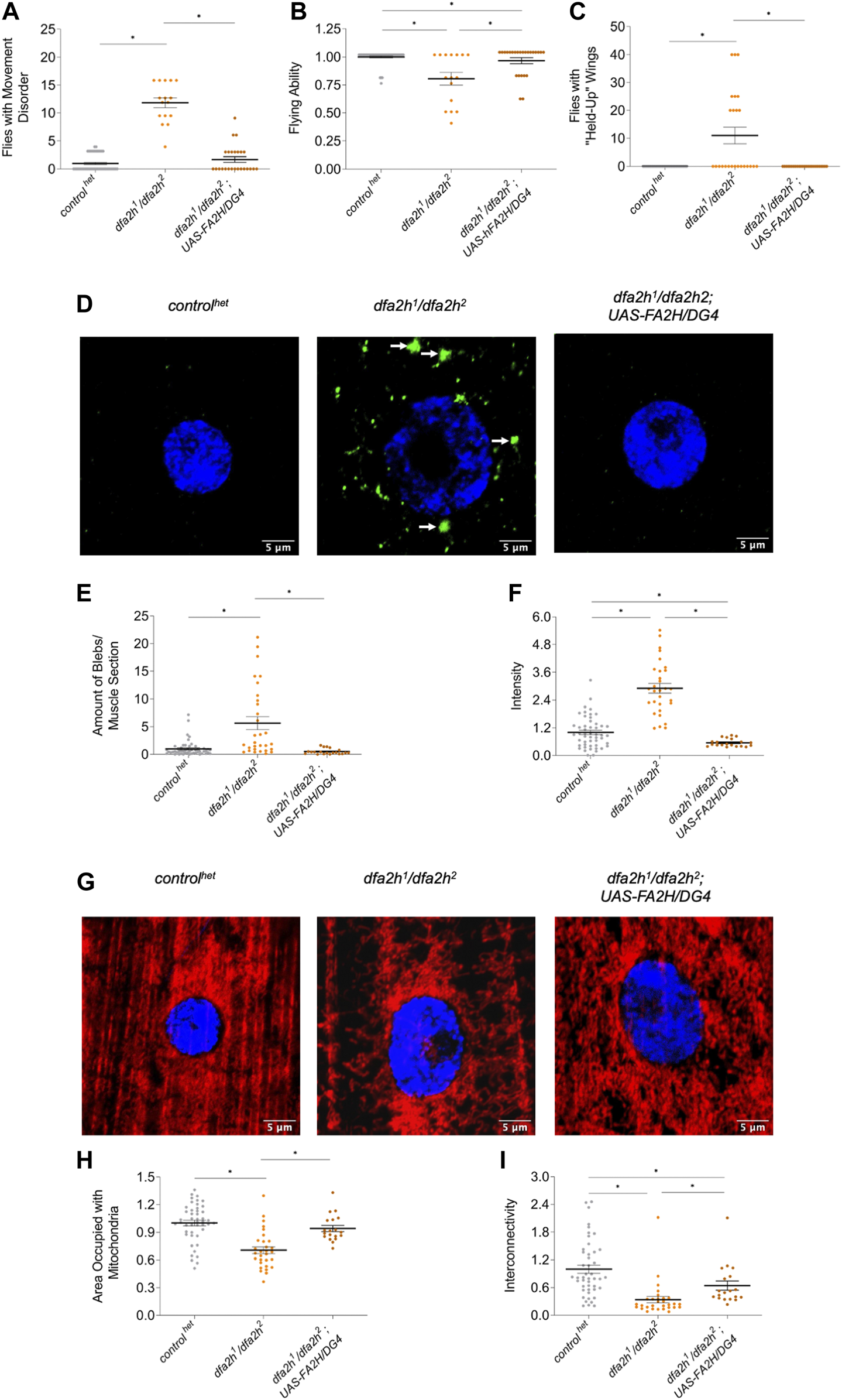 Overexpression of human FA2H rescues the loss of dfa2h phenotypes. The rescue line shows (A) reduced number of flies with movement defects, (B) increased flight ability, and (C) lower number of flies with “held-up” wings compared to the dfa2h1/dfa2h2 mutant. For these experiments, groups of four to five flies were formed (nflight and movement = 25–46; nwing = 25–46). (D) Immunostaining of larval muscle sections with the autophagy marker dLC3 revealed (E) reduced accumulations and (F) intensity in rescue flies compared to compound heterozygous mutants (n = 20–50). The arrows indicate dLC3 accumulations. The green labeling displays dLC3 labeling to visualize autophagy, whereas the blue signal represents DAPI labeling to visualize the nucleus. (G) Larval muscle sections labeled with the mitochondrial marker ATP5a show (H) increased mitochondrial density and (I) interconnectivity in the rescue line compared with the dfa2h1/dfa2h2 mutant line (n = 18–46). The red signal shows ATP5a labeling to visualize mitochondria, and the blue signal shows DAPI labeling to visualize the nucleus. The dots in all these graphs represent individual data points. The controls are set to 1, and the lines show the mean ± SEM. The Kruskal–Wallis test was performed for group comparison with a significance level of p < 0.05 (A–C, E–F, H–I*).