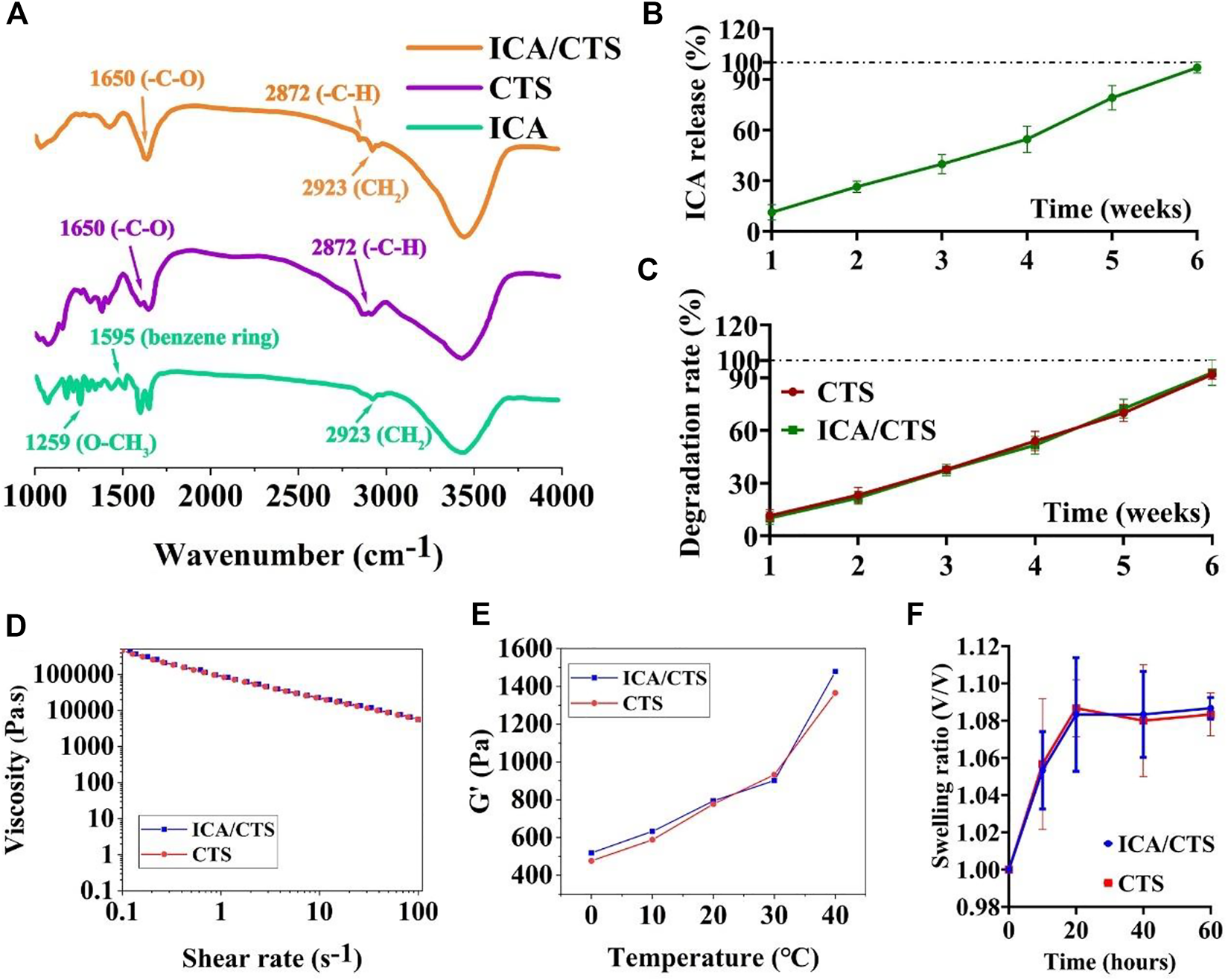 FTIR, ICA release kinetics, and degradation rate examinations. FTIR examination of pristine ICA and CTS, as well as ICA/CTS samples (A). In vitro ICA release kinetics in ICA/CTS hydrogel immersed in PBS for 6 weeks (B). In vitro degradation rate of CTS and ICA/CTS hydrogels immersed in chondrocyte co-culture medium for 6 weeks (C). Viscosity (D), dynamic storage moduli (G′) (E), and swelling ratio (F) of CTS and ICA/CTS hydrogels. (n = 3; data are presented as means ± SD for each group).