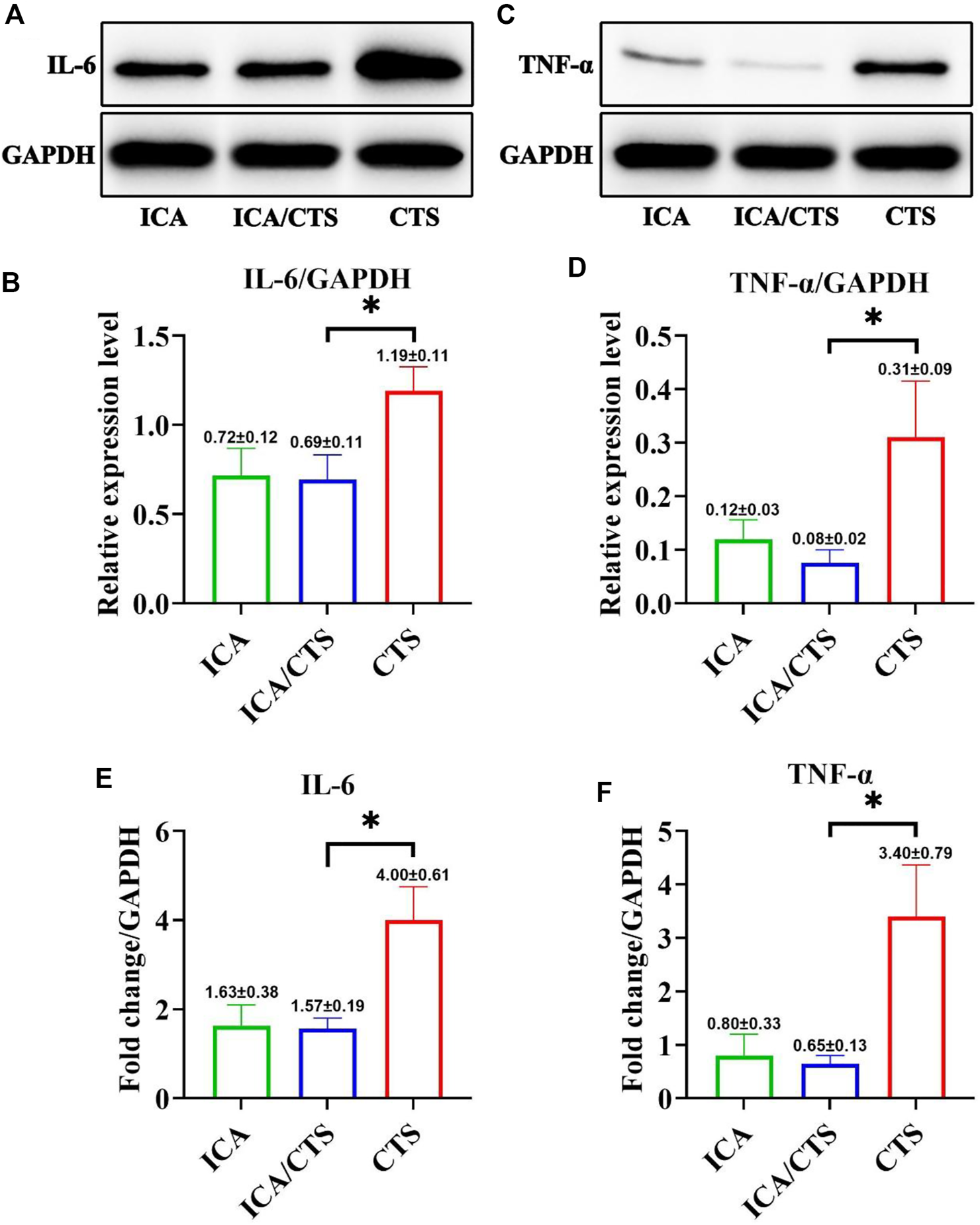 Evaluation of in vitro anti-inflammatory effects of ICA/CTS and CTS hydrogels incubated with RAW264.7 macrophages for 24 h. The protein expression levels of IL-6 (A,B) and TNF-α (C,D) detected by WB examination in ICA/CTS and CTS groups. Gene expression of IL-6 and TNF-α detected by RT-PCR in the ICA/CTS and CTS groups (E,F). (n = 3; data are presented as means ± SD for each group, *p < 0.05).