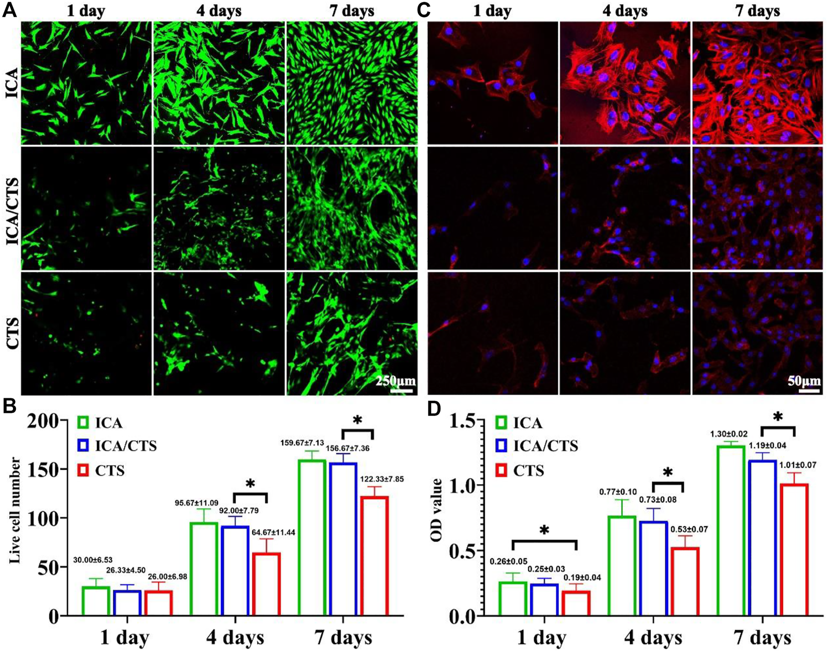 Cytocompatibility evaluation of ICA/CTS and CTS hydrogels with in vitro co-cultured with chondrocytes for 1–7 days. Live/dead staining of samples in the ICA, ICA/CTS, and CTS groups (A). Quantitative analysis of live cell number (B). Phalloidin staining images in ICA, ICA/CTS, and CTS groups (C). OD value detected in the CCK-8 assay in ICA, ICA/CTS, and CTS groups (D). (n = 3; data are presented as means ± SD for each group, *p < 0.05).