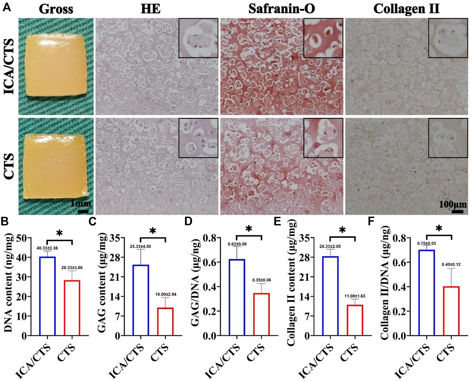 In vitro chondrogenesis in ICA/CTS and CTS hydrogels colonized with chondrocytes for 2 weeks. Gross, HE, Safranin-O, and collagen type II immunohistochemical staining of samples in ICA/CTS and CTS groups (A). The black-framed images represent the magnified views. Quantitative analyses of DNA, GAG, GAG/DNA, collagen type II contents, and collagen II/DNA in ICA/CTS and CTS groups (B–F). DNA, GAG, and collagen II normalized to tissue wet weight. (n = 3; data are presented as means ± SD for each group, *p < 0.05).