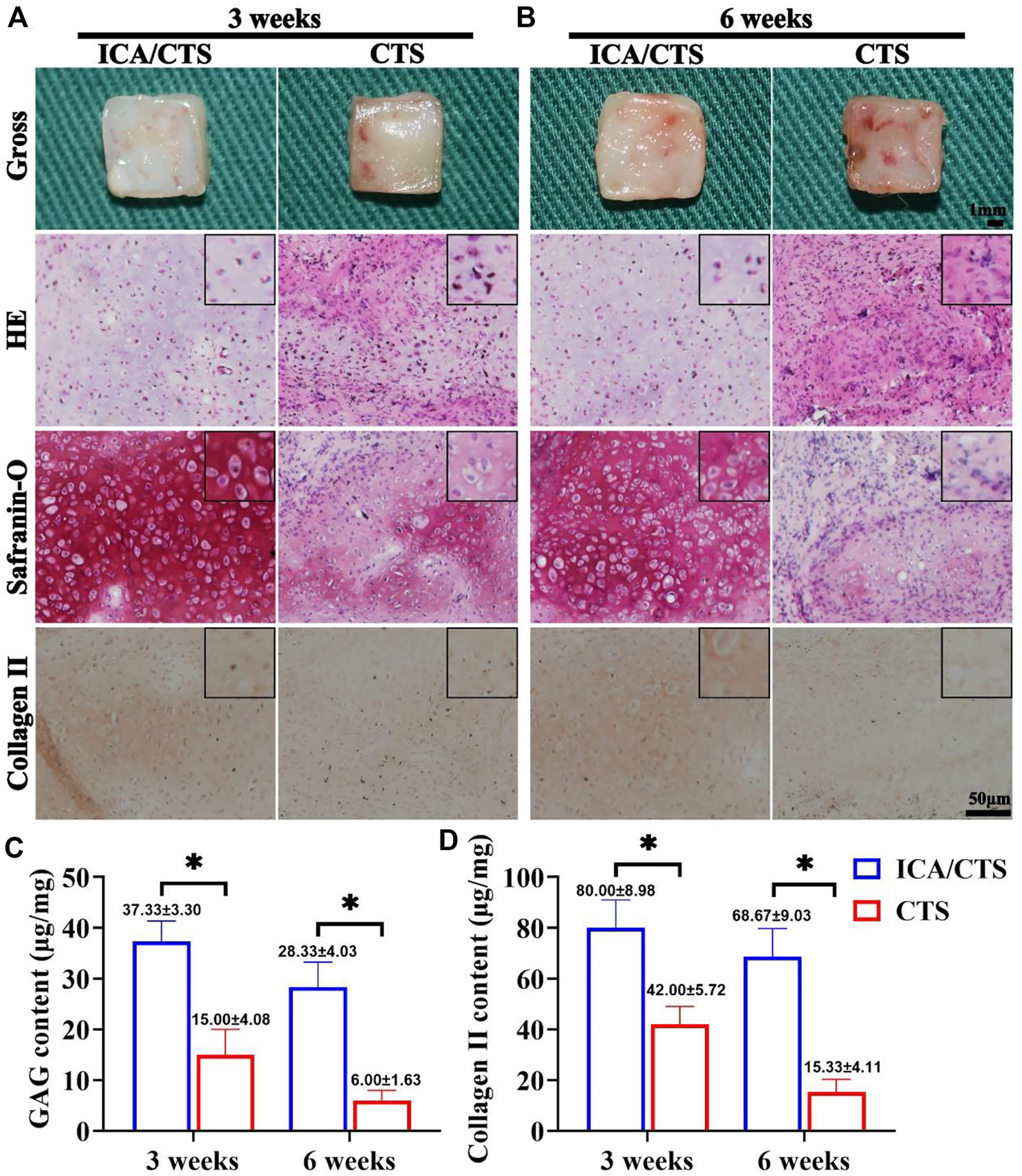 Cartilage regeneration of samples in the ICA/CTS and CTS groups after subcutaneous implantation in goats for 3 and 6 weeks. Gross, HE, Safranin-O, and collagen type II immunohistochemical staining of samples in the ICA/CTS and CTS groups at 3 weeks (A) and 6 weeks (B). The black-framed images represent the magnified views. Quantitative analyses of GAG and collagen type II contents in the ICA/CTS and CTS groups (C,D). GAG and collagen II contents normalized to the tissue wet weight. (n = 3; data are presented as means ± SD for each group, *p < 0.05).