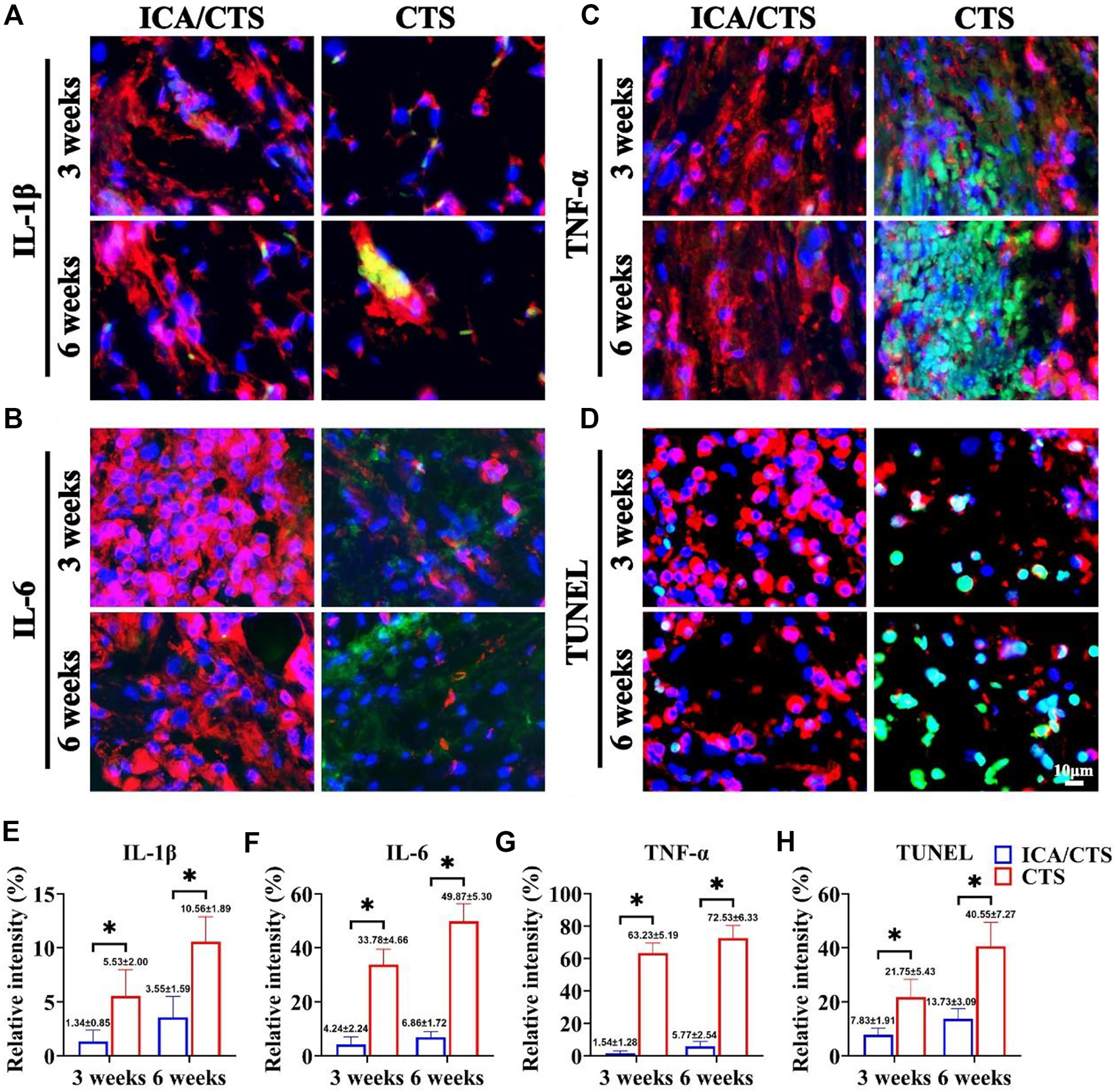 Inflammatory reaction of samples in the ICA/CTS and CTS groups after subcutaneous implantation in goats for 3 and 6 weeks. Immunofluorescence staining for IL-1β, IL-6, TNF-α, and TUNEL in samples from the ICA/CTS and CTS groups [(A–D), marked with green color], in which a chondrogenic marker of collagen type II was stained with red color. Relative intensity corresponding to the positive expression of IL-1β, IL-6, TNF-α, and TUNEL in the ICA/CTS and CTS groups (E–H). (n = 3; data are presented as means ± SD for each group, *p < 0.05).