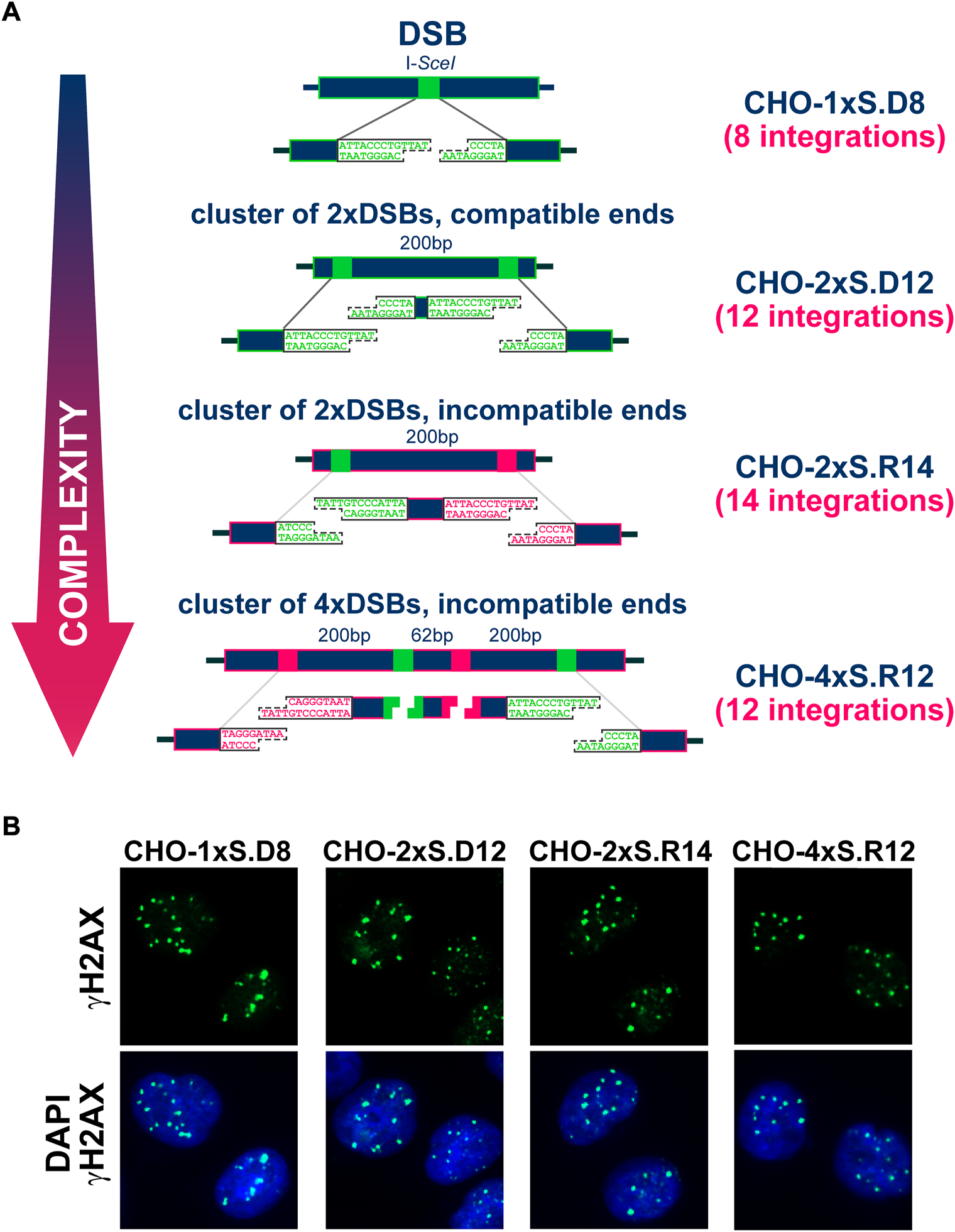 (A) Stably integrated constructs carrying different combinations of I-SceI recognition sites engineered at different distances and orientations to model individual DSBs or DSB-clusters. The names of the corresponding clonal cell lines are indicated in dark blue. (B) Representative images showing the formation of γH2AX foci in CHO clones transfected with I-SceI expressing plasmid.