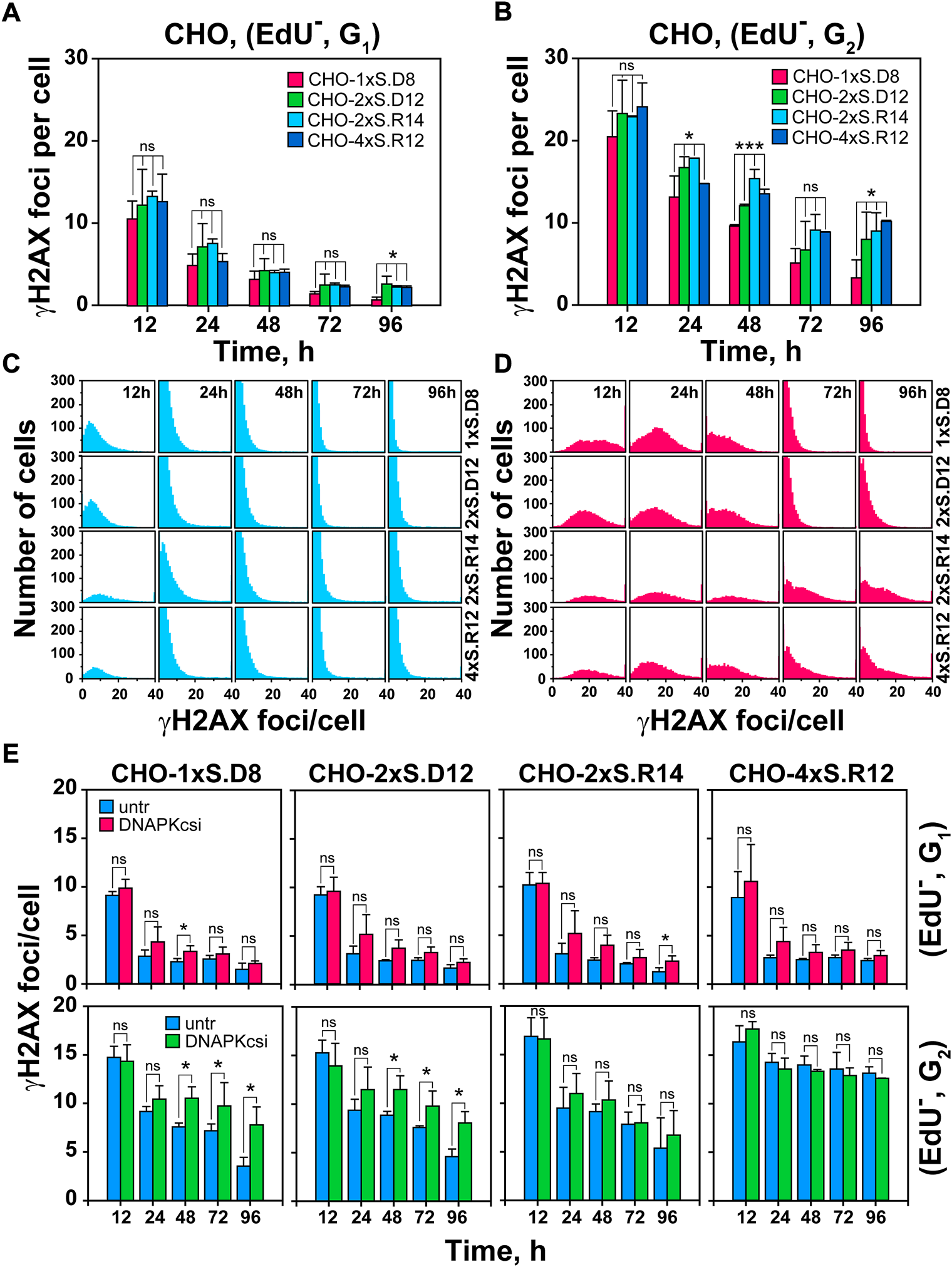 To facilitate the interpretation of the results obtained, we follow here γH2AX foci in a cell-cycle-dependent manner, for up to 96 h after I-SceI transfection. We focus on the G1-and G2-phase compartments, as delimited by DAPI-signal intensity in EdU− cells (EdU given 30ʹ before processing of each time point), to reduce complications from background signals generated in S-phase cells (Figures 1B, 2 and Supplementary Figure S1A). An additional reason for this choice is that recent work demonstrates unexpected but highly significant mechanistic shifts in DDR and DSB-repair, depending not only upon the phase of the cell-cycle cells are irradiated, but also the phase of the cell-cycle responses are analyzed (Mladenov et al., 2019a; Mladenov et al., 2019b; Mladenov et al., 2020). We note however that because, in contrast to IR, damage induction by I-SceI is not instantaneous but protracted, our cell-cycle-specific analysis is devoid of information on the phase of the cell-cycle DSBs are generated.