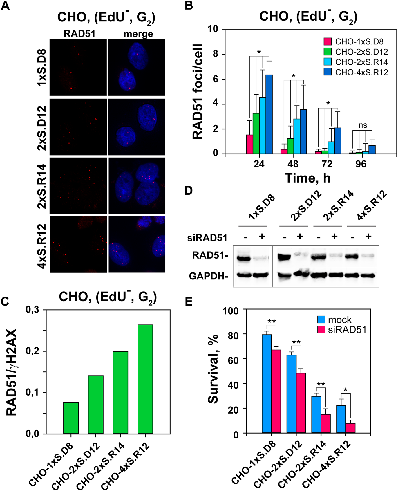 Stronger RAD51 accumulation to DSB-clusters than individual DSBs. (A) Representative images of RAD51 foci in I-SceI-transfected CHO clones. (B) QIBC of RAD51 foci, specifically in the EdU–G2-phase cells. The selection of EdU–, G2-phase cells is according to the gates defined in Supplementary Figure S1B. Only results for EdU–, G2-phase cells are presented, as there are no detectable RAD51 foci in the G1-cell population. (C) Ratio between RAD51 and γH2AX foci in the indicated CHO clones, as a measure of the fraction of DSBs that engage HR. It is calculated using the data from the 24 h time point, where the maximum in RAD51 foci is observed and γH2AX foci numbers are close to the maximum measured at 12 h (D) Western-blot analysis showing the level of RAD51 depletion. (E) Survival of transfected cells after depletion of RAD51 recombinase by siRNA interference calculated using the plating efficiency measured in mock-transfected cells of the corresponding clone. Data represent means and standard deviations (±SD) from three independent experiments. (ns, no significance, p > 0.05); (*p ≤ 0.05); (**p ≤ 0.01); (***p ≤ 0.001); (****p ≤ 0.0001).