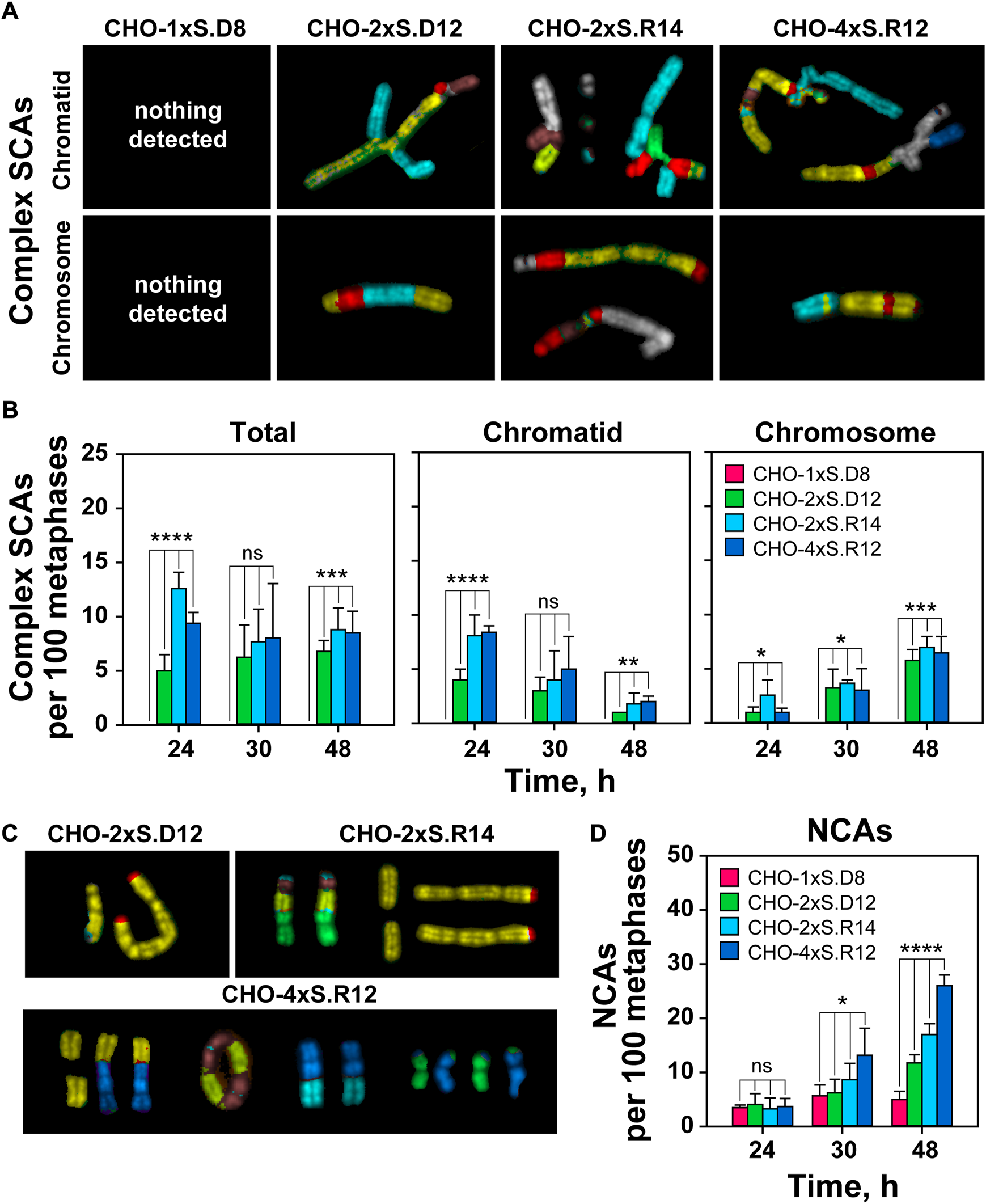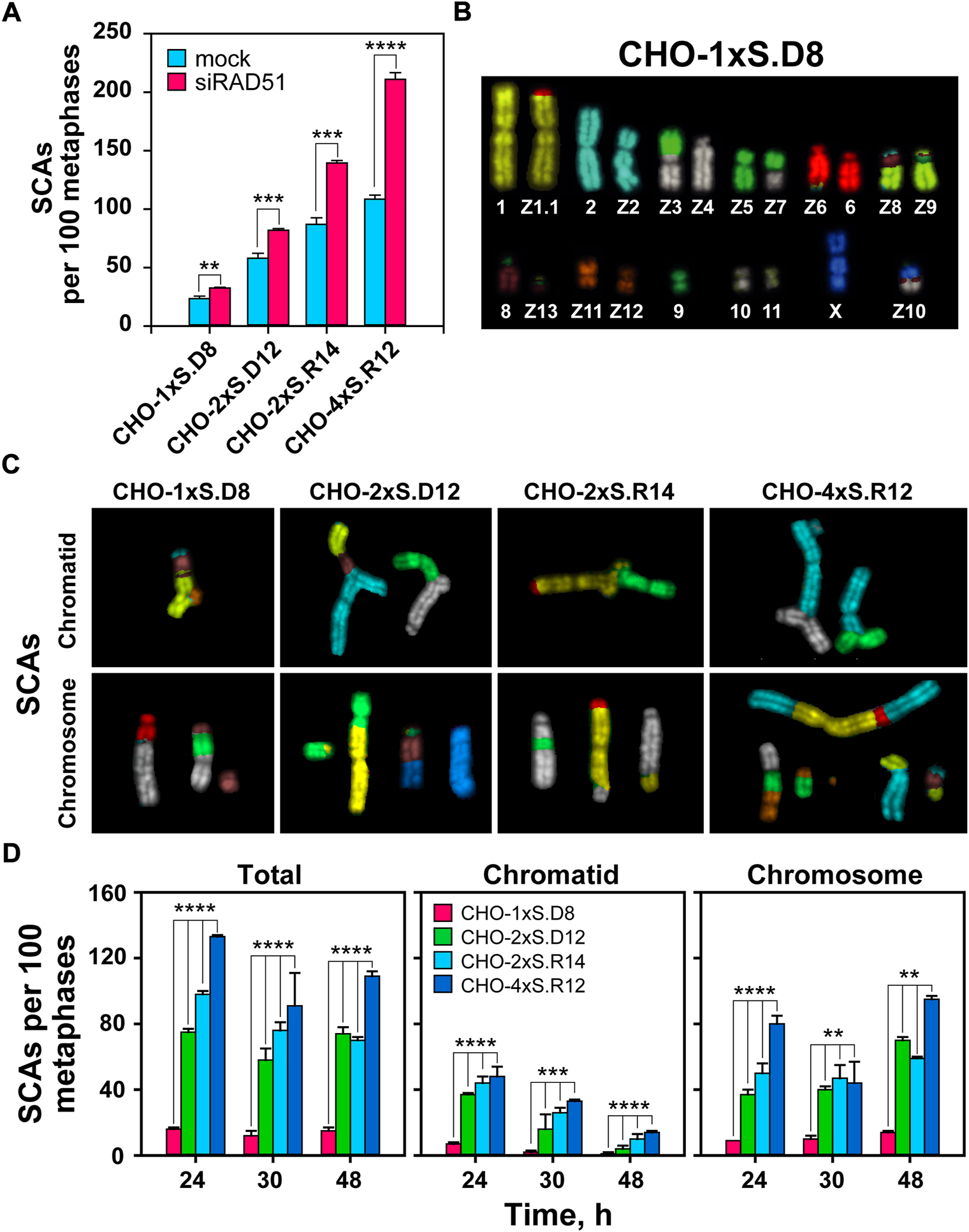 mFISH analysis of SCAs following induction of single and clustered DSBs. (A) QA of SCAs scored 24 h after I-SceI transfection in RAD51-depleted CHO clones. (B) mFISH karyotype of CHO-1xS.D8 cells. Note: the karyograms of undamaged chromosomes in all CHO clones are identical with the karyogram of CHO10B4 cells. (C) Representative images of chromatid- and chromosome-type SCAs captured 24 h after I-SceI transfection. (D) QA of chromatid and chromosomal abnormalities scored at the indicated times after transfection of the indicated CHO clones. The numbers of SCAs scored in mock-transfected cells have been subtracted from the results presented. At least 100 metaphases are scored per metaphase spread. Data represent means and standard deviations (±SD) from three independent experiments. (ns, no significance, p > 0.05); (*p ≤ 0.05); (**p ≤ 0.01); (***p ≤ 0.001); (****p ≤ 0.0001).
