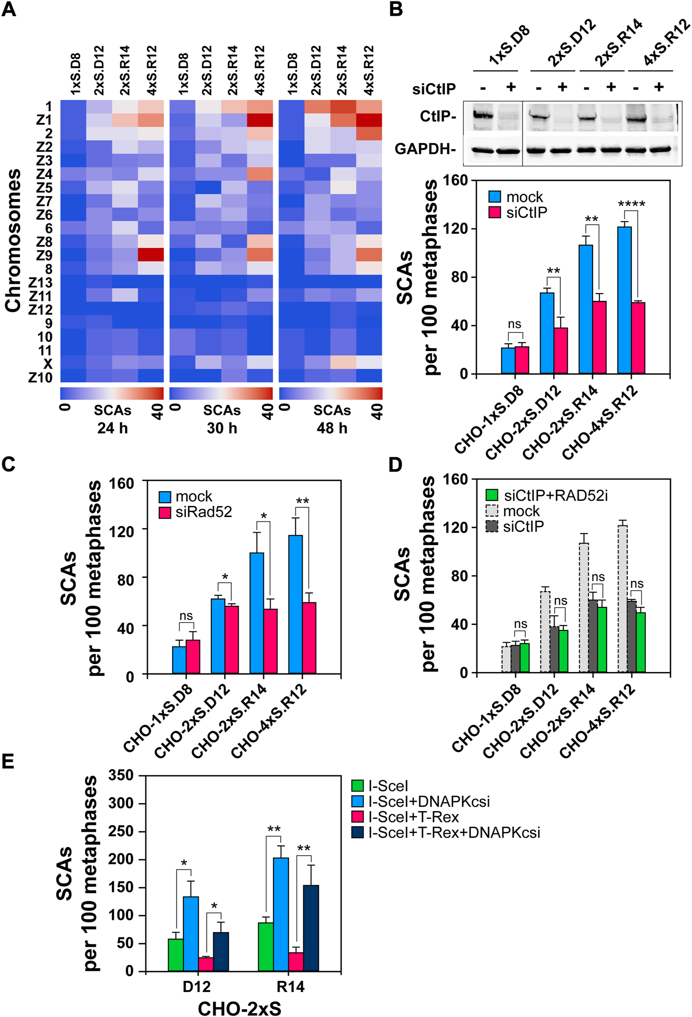 Depletion of CtIP or RAD52 and blunting of DNA-ends reduces SCAs in cells harboring DSB-clusters (A) Heat-map plots generated on the Orange software platform showing SCAs-frequencies of individual hamster chromosomes in the indicated clones. (B)Upper Panel: Western-blot analysis showing CtIP knock-down in the indicated clones; Lower Panel: QA of SCAs scored 24 h post-I-SceI transfection following CtIP depletion. (C) As in Figure 6B, Lower Panel, but for RAD52-depleted cells (D) QA of SCAs scored 24 h post I-SceI transfection following CtIP depletion, combined with RAD52 inhibition. RAD52i was administered immediately after transfection and was kept for 24 h. Results represent means and SD from at least three independent experiments; only two independent experiments are conducted for CtIP-depletion in combination with RAD52 inhibition. (E) SCAs scored 24 h post transfection with either the I-SceI expression vector alone, or together with the TREX-expression vector in CHO-2xS.D12 or CHO-2xS.R14 cells, in the presence or absence of DNA-PKcsi. At least 100 metaphases are scored per sample. Data represent means and standard deviations (±SD) from three independent experiments. (ns, no significance, p > 0.05); (*p ≤ 0.05); (**p ≤ 0.01); (***p ≤ 0.001); (****p ≤ 0.0001).