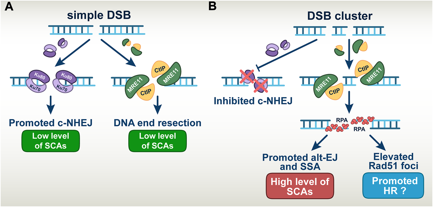 A model describing the altered DSB repair pathway balance in simple versus complex DSBs (A) Simple DSBs engage repair by both c-NHEJ and DNA end-resection dependent pathways, which results in low level of SCAs formation. (B) DSBs clusters suppress the repair by c-NHEJ thus allowing the involvement of error-prone DNA end-resection dependent repair pathways. This manifests in the increased level of SCAs when alt-EJ and SSA are involved in repair. Elevated number of RAD51 foci indicates the involvement of HR in the repair of DSB-clusters; However, it remains unclear to what extent HR is productive.