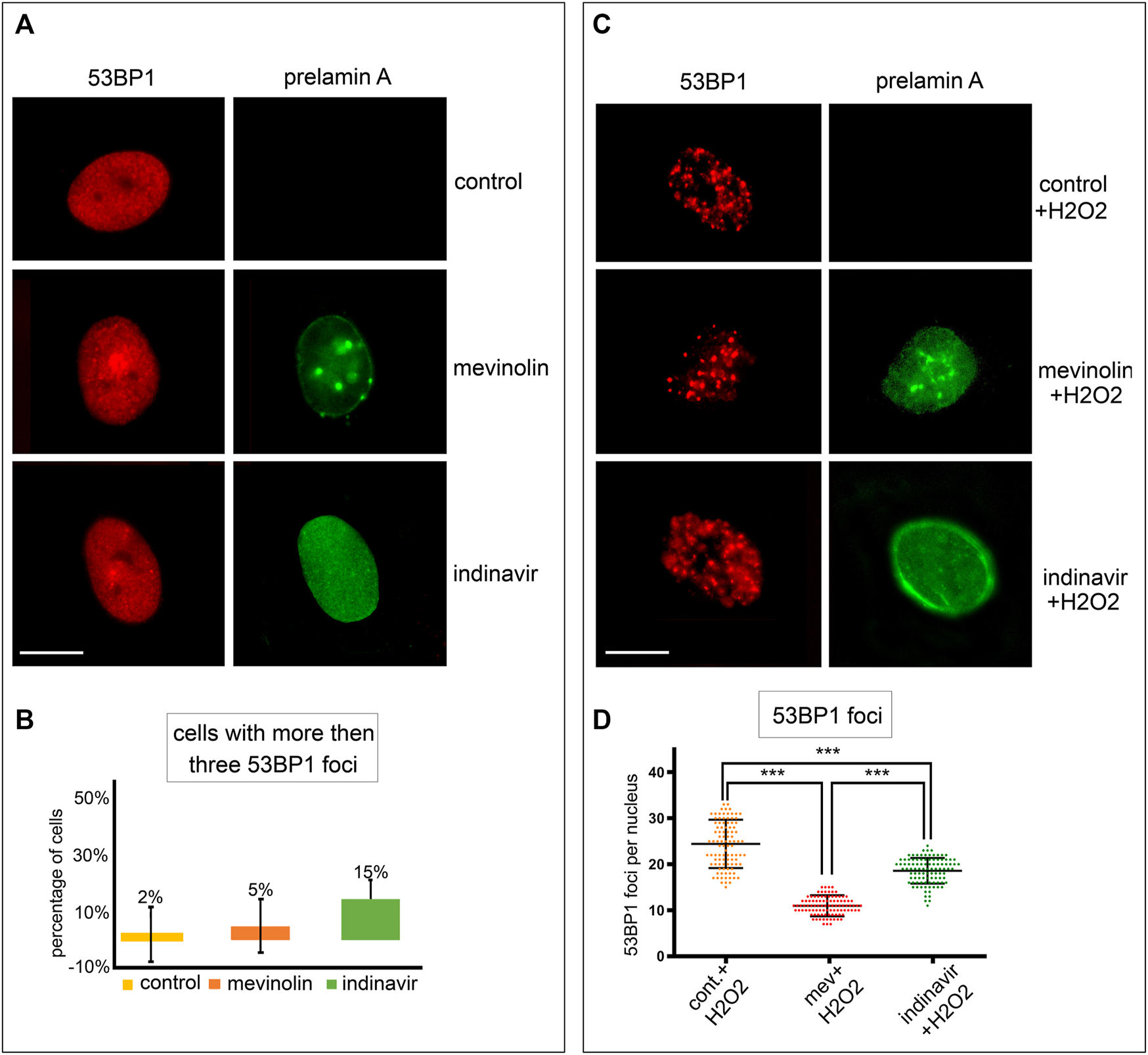 Under basal conditions, the number of cells showing more than three 53BP1 foci in the nucleus was not significantly different between untreated and mevinolin-or indinavir-treated cells as calculated by statistical analysis, although a slight increase was observed in cells that accumulated farnesylated prelamin A upon indinavir treatment (Figures 1A,B).
