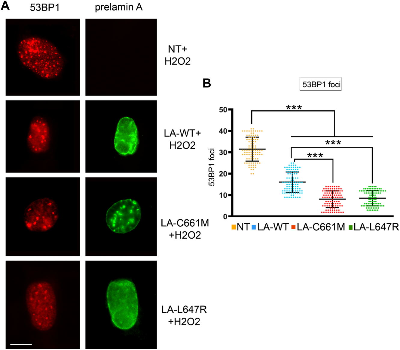 Stress-induced 53BP1 foci in human dermal fibroblasts overexpressing prelamin A mutants. (A) Immunofluorescence detection of 53BP1 (red) and FLAG-tagged prelamin A (green) in non-transfected fibroblasts (NT) or fibroblasts expressing wild-type prelamin A (LA-WT), non-farnesylated prelamin A (LA-C661M) or farnesylated and carboxymethylated prelamin A (LA-L647R) upon H2O2 administration. Bar, 10 μm. (B) Dot plot showing the number of 53BP1 foci per nucleus as detected in (A). Experiments were conducted in triplicate, data analyzed were based on an average of 100 cells. Error bars, mean ± SD. Comparison between the groups was determined by using the one-way ANOVA test. Asterisks show statistical significance (***, p < 0.001).