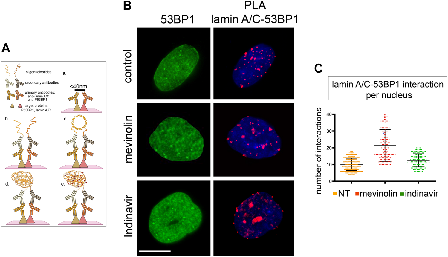53BP1-lamin A/C binding in human dermal fibroblasts accumulating prelamin A, (A) Schematic representation of PLA protocol showing primary antibodies and interactors analysed in this study (created with BioRender.com). The maximum distance between interactors that allows direct binding and detection by PLA is indicated on the black bar in panel a. Binding of primary antibodies and secondary antibody-bound probes is shown in panel b. Ligase-catalysed oligonucleotide annealing is shown in c. Amplification of oligonucleotides is represented in d, incorporation of fluorescent probes is represented in e. (B) 53BP1 localization and PLA of lamin A/C-53BP1 interactions in untreated, mevinolin- or indinavir-treated cells. 53BP1 was detected by immunofluorescence labeling with a specific antibody (green). Interactions between lamin A/C and 53BP1 are revealed as red signals. Chromatin was counterstained with DAPI (blue). Bar, 10 μm. (C) Dot plot showing the number of PLA signals per nucleus as detected in (B). Experiments were conducted in triplicate, data analyzed were based on an average of 100 cells. Error bars, mean ± SD. Comparison between the groups was determined by using the one-way ANOVA test.