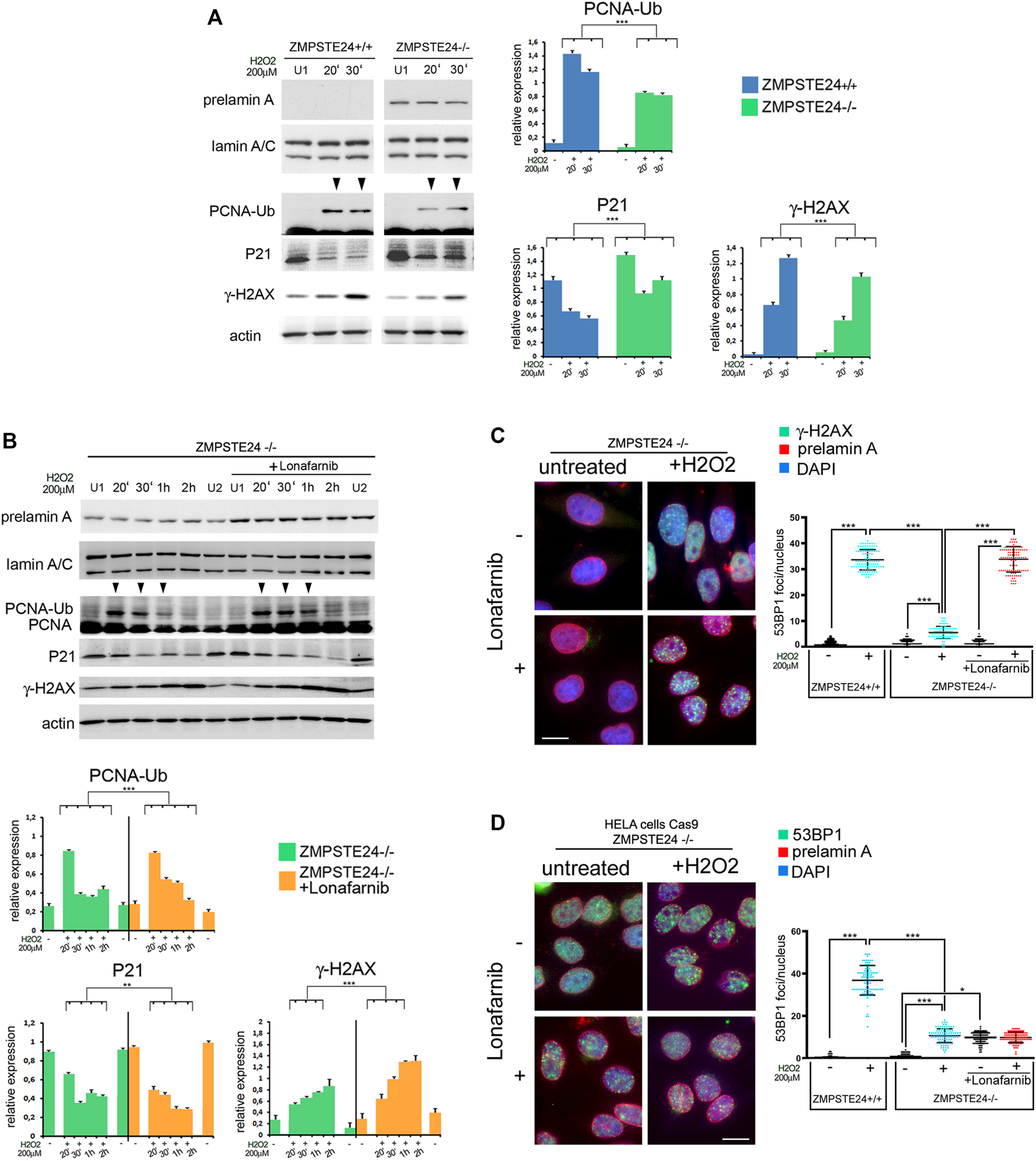 Early stage DNA damage response in ZMPSTE24−/−HeLa cells accumulating farnesylated prelamin A (A) Western blot analysis performed in ZMPSTE24+/+ (ZMPSTE24+/+) and ZMPSTE24−/− HeLa cells (ZMPSTE−/−) subjected to oxidative stress (H2O2). Prelamin A (prelamin A), lamin A/C (lamin A/C), mono-ubiquitinated-PCNA (PCNA-Ub), P21 (P21) and gamma-H2AX (γ-H2AX) bands are shown. Actin was evaluated as a protein loading control. (U1) indicates H2O2-untreated samples collected at 30 min, while 20′ and 30′ indicates samples collected after 20 and 30 minutes after H2O2 administration respectively. Arrowheads indicate time points in which the mono-ubiquitinated form of PCNA was detectable. Statistical analysis of mean values obtained from triplicate western blot densitometry (relative densitometry normalized to loading controls) was performed by Student’s t test. Significantly different values are indicated by asterisks: *** = p < 0.001. (B) Western blot analysis performed in ZMPSTE24−/− Hela cells (ZMPSTE24−/−) subjected to oxidative stress (H2O2) in the presence or absence of Lonafarnib (+Lonafarnib). Prelamin A (prelamin A), lamin A/C (lamin A/C), PCNA (PCNA), mono-ubiquitinated-PCNA (PCNA-Ub), P21 (P21) and gamma- H2AX (γ-H2AX) bands are shown. Actin was evaluated as a protein loading control. Samples were taken at various time points after H2O2 administration as indicated in each panel. (U1) and (U2) indicate H2O2-untreated samples collected at 30 min and 2 h, respectively. Arrowheads indicate time points in which the mono-ubiquitinated form of PCNA was detectable. Statistical analysis of mean values obtained from triplicate western blot densitometry (relative densitometry normalized to loading controls) was performed by Student’s t test. Significantly different values are indicated by asterisks: **, p < 0.01,***, p < 0.001, (C) Immunofluorescence analysis of gamma-H2AX (γ-H2AX, green) and prelamin A (prelamin A, red) performed in control or Lonafarnib-treated ZMPSTE24−/− Hela cells under basal condition (untreated) and after 4 h of H2O2 administration (+H2O2). Chromatin was counterstained with DAPI (blue). Dot plot shows the number of gamma-H2AX foci in ZMPSTE24+/+ and ZMPSTE24−/− Hela cells. Experiments were conducted in triplicate and 100 nuclei per sample were analyzed. Error bars, mean ± SD. Comparison between the groups was determined by using the one-way ANOVA test. Asterisks show statistical significance (***, p < 0.001). Bar, 10 μm, (D) Immunofluorescence analysis of 53BP1 (green) and prelamin A (prelamin A, red) performed in control or Lonafarnib-treated ZMPSTE24−/− Hela cells under basal condition (untreated) and after 4 h of H2O2 administration (+H2O2). Chromatin was counterstained with DAPI (blue). Dot plot shows the number of gamma-H2AX foci in ZMPSTE24+/+ and ZMPSTE24−/− Hela cells. Experiments were conducted in triplicate and 100 nuclei per sample were analyzed. Comparison between the groups was determined by using the one-way ANOVA test. Asterisks show statistical significance (*, p < 0.05; ***, p < 0.001). Bar, 10 μm.