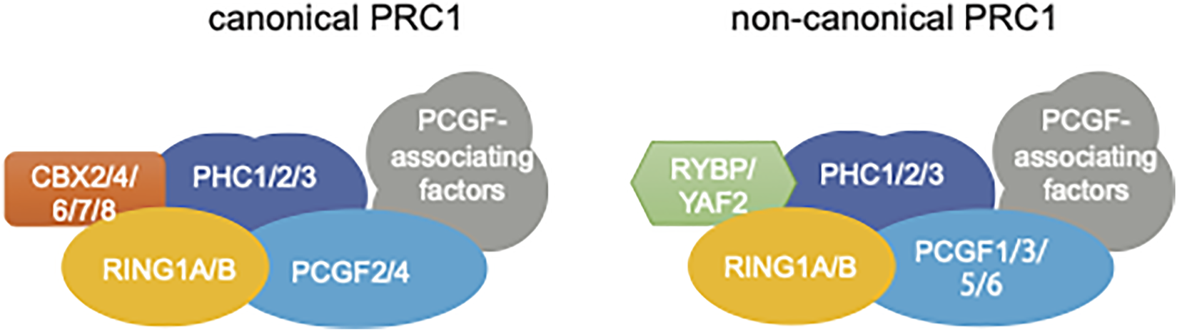 Subunit composition of Polycomb repressive complex 1 (PRC1), either canonical PRC1 (cPRC1, left) or non-canonical PRC1 (ncPRC1; right). The cPRC1 complex is composed of four core subunits, include a RING (either RING1A or RING1B), a PHC protein, a CBX (either CBX2, CBX4, CBX6, CBX7, or CBX8), a PCGF (either PCGF2 or PCGF4), in addition to associating proteins. For the ncPRC1 complex, CBX is replaced by either RYBP or YAF2, the PCGF being either PCGF1, PCGF3, PCGF5, or PCGF6, in addition to other ncPRC1-specific associating factors.
