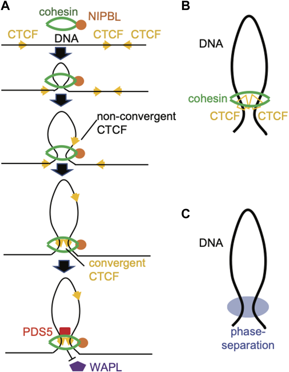 Schematic of 3D genome structure. (A) Illustration of a loop extrusion model, in which NIPBL, stabilized by BRD4, loads the ring-like cohesin complex onto target chromatin and activates its ATPase to extrude the DNA fiber. A pair of convergent CTCF proteins, and not those in the non-convergent configuration, stall cohesin’s sliding and prevent WAPL from releasing the cohesion complex off chromatin. PDS5 binds cohesin to stabilize its residence on the loop anchor. (B) Long-range chromatin interactions driven by the cohesion complex, with CTCFs serving as anchors. (C) Long-range chromatin contacts driven by a phase separation-based mechanism.