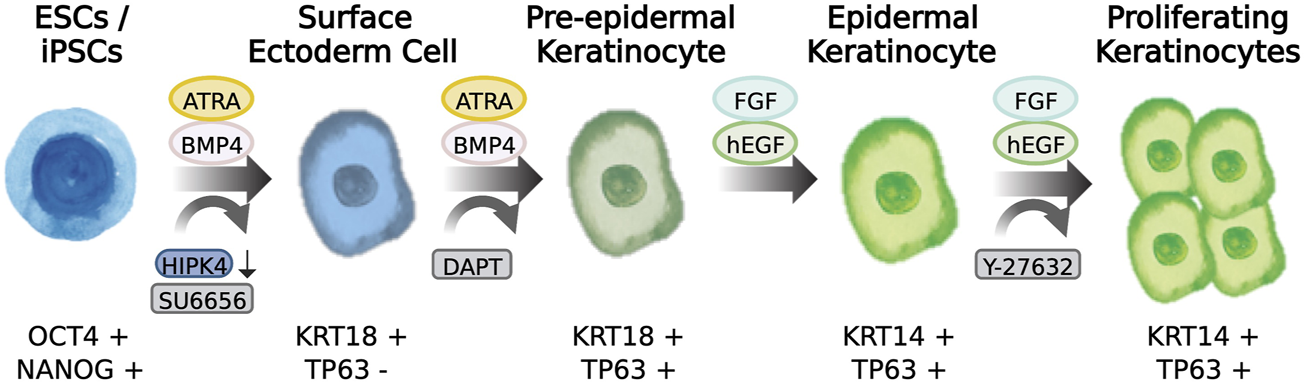 Studies of embryonic skin development using various animal models have helped identify appropriate culture conditions for PSC differentiation along the necessary lineages to recreate the layers of the skin. Retinoic acid (RA) fulfills many important functions during the development of epidermis, the limbs, and the secondary palate (Mammadova et al., 2016). Impaired skin differentiation and abnormal stratification were observed in mice overexpressing a dominant-negative form of the retinoic acid receptor (RAR) under the regulation of the Keratin 14 promoter, capable of inhibiting the endogenous activities of RAR α, β, and γ (Saitou et al., 1995). Andrews reported that treating human ESCs with RA was sufficient to induce differentiation into neural ectoderm lineages (Andrews, 1984). Palecek and others applied RA to differentiate human ESCs into keratinocytes resulting in a significant increase in the number of cells expressing dN-p63 and KRT14, followed by expression of the terminal epidermal differentiation markers KRT10, Involucrin and Filaggrin (Metallo et al., 2008). Furthermore, topical application of RA to human epidermal keratinocytes cultured in vitro sustained expression of the dN-p63a isoform and stimulated proliferation of skin progenitor cells (Bamberger et al., 2002).