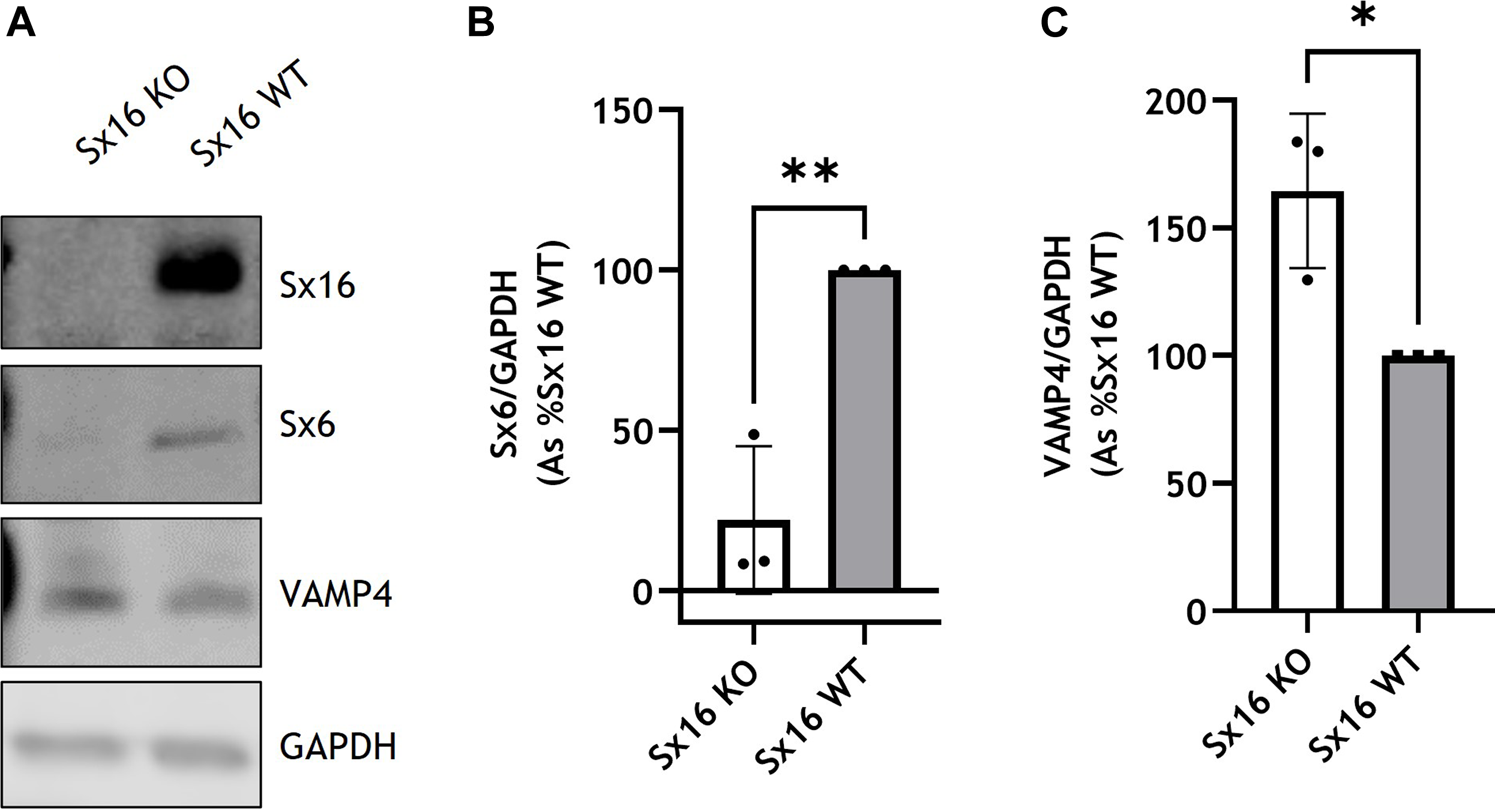 Sx16 interacts with both Sx6 and VAMP4 (Mallard et al., 2002; Perera et al., 2003). Here we report that knockout of Sx16 significantly downregulated levels of the cognate Qbc-SNARE Sx6 whereas the proposed R-SNARE VAMP4 was upregulated. The overexpression of VAMP4 may reflect upregulation of an alternative SNARE pathway as plasticity of SNARE proteins has been well documented (Zhao et al., 2009; Sadler et al., 2015). Transient knockdown of Sx16 in 3T3-L1 adipocytes by electroporation of Sx16 morpholine antisense oligonucleotides only modestly affected Sx6 expression (Proctor et al., 2006). The observed downregulation of Sx6 in this study may be an adaptive response due to the complete lack of Sx16 rather than the transient effects observed by Proctor et al.