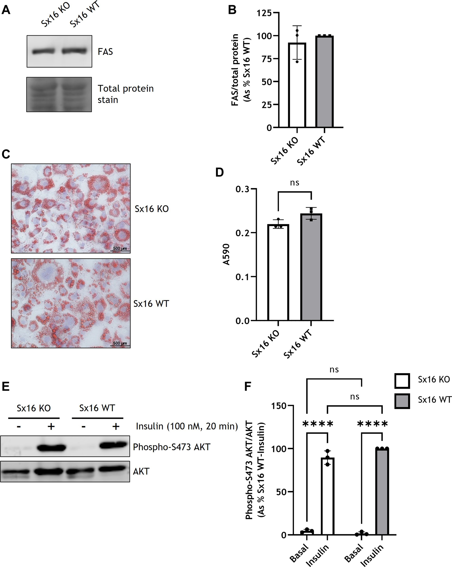 Sx16 knockdown does not affect 3T3-L1 adipogenesis. (A) Lysates prepared from Sx16 KO or WT cells were immunoblotted for fatty acid synthase (FAS) and stained for total protein with Revert™ total protein stain. (B) Quantification of FAS levels was determined by comparison with total protein using densitometric analysis. Data shown represent the mean ± SD of three independent experiments. Data is presented as % relative to Sx16 wild type cell lysate, (C) The indicated populations of adipocytes were stained with Oil Red O and Mayers Hematoxylin. Representative images are shown (D) Oil Red O stain was eluted from stained cells and absorbance at 590 nm measured. Data shown represent the mean ± SD of three independent experiments (E) Sx16-KO or WT cells were incubated with or without insulin as indicated and lysates prepared as described. Shown are representative immunoblots of phospho-S471 AKT and total AKT. (F) Quantification of AKT phosphorylation was determined by comparison with total AKT using densitometric analysis. Data is presented as % relative to insulin stimulated Sx16 wild type from three experiments of this type, each point on the graph is a single biological replicate. ****p < 0.0001 as assessed by two-way ANOVA.
