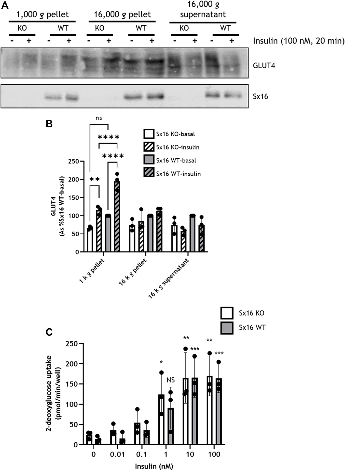 Although we have observed metabolic perturbations in Sx16 knockout cells, clearly further and detailed metabolomic studies would be required to establish the mechanistic basis of this. It is of interest to note that recent work from our laboratory examining obese patients with and without Type-2 diabetes revealed that diabetes is accompanied by a reduction in Sx16 levels in skeletal muscle (Livingstone et al., 2022). Such data provide further support for the idea that Sx16 is important for GLUT4 trafficking.