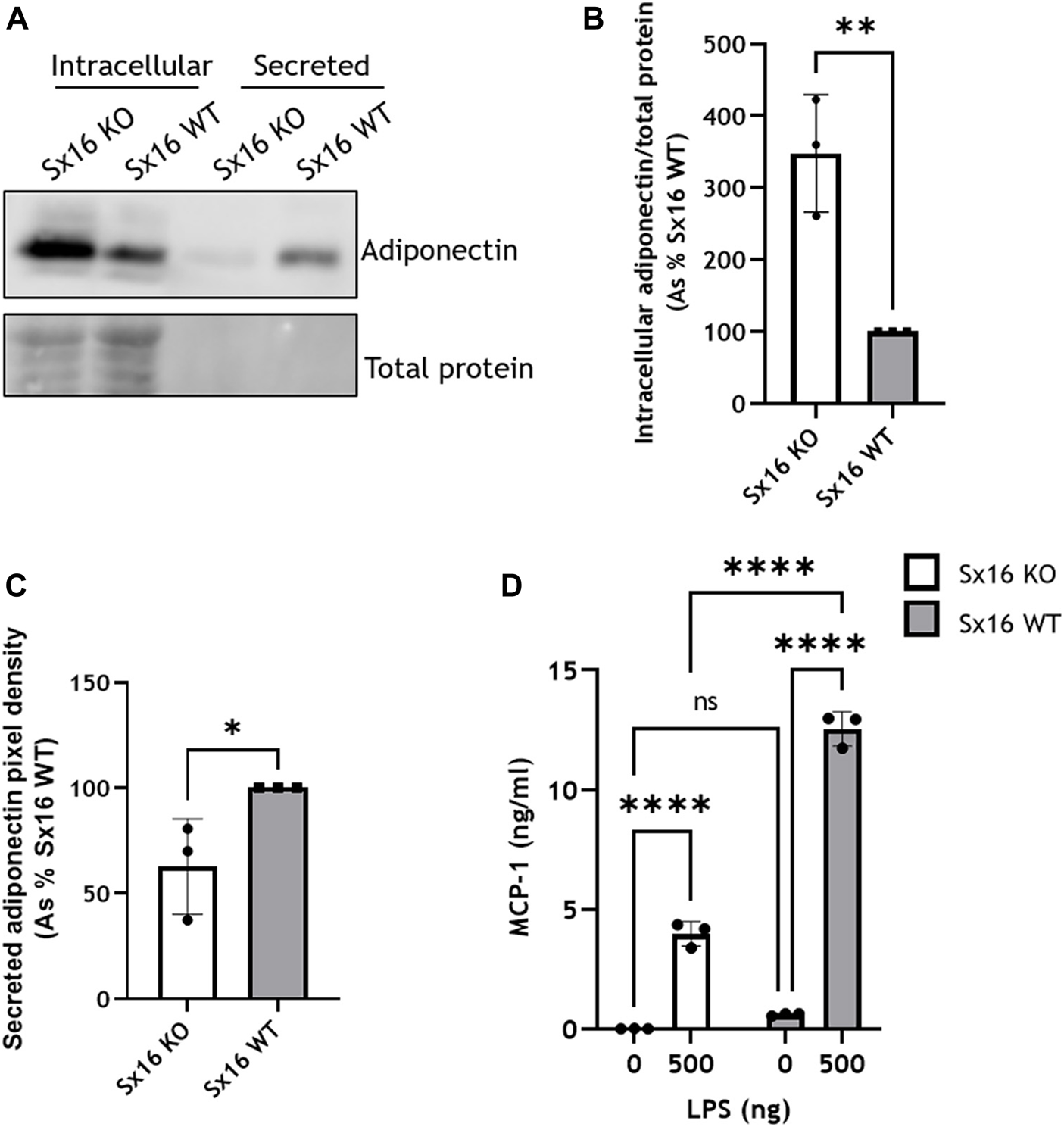 Adipokine secretion in impaired in Sx16 knockout adipocytes. (A) Adipocytes were cultured in serum free DMEM for 18 h prior to media collection and preparation of cell lysates from Sx16-KO or WT cells as described. Shown is a representative immunoblot of adiponectin and total protein stain (B) Quantification of intracellular adiponectin relative to total protein stain by densitometric analysis (C) Quantification of secreted adiponectin by densitometric analysis (D) Adipocytes were stimulated with 500 ng lipopolysaccharide (LPS) for 18 h in serum free media, conditioned media was collected and MCP-1 content assessed by Quantikine® ELISA. Data shown represent the mean ± SD of three independent experiments. *p < 0.05, **p < 0.01, ***p < 0.001 and ****p < 0.0001; n.s. = non significant.