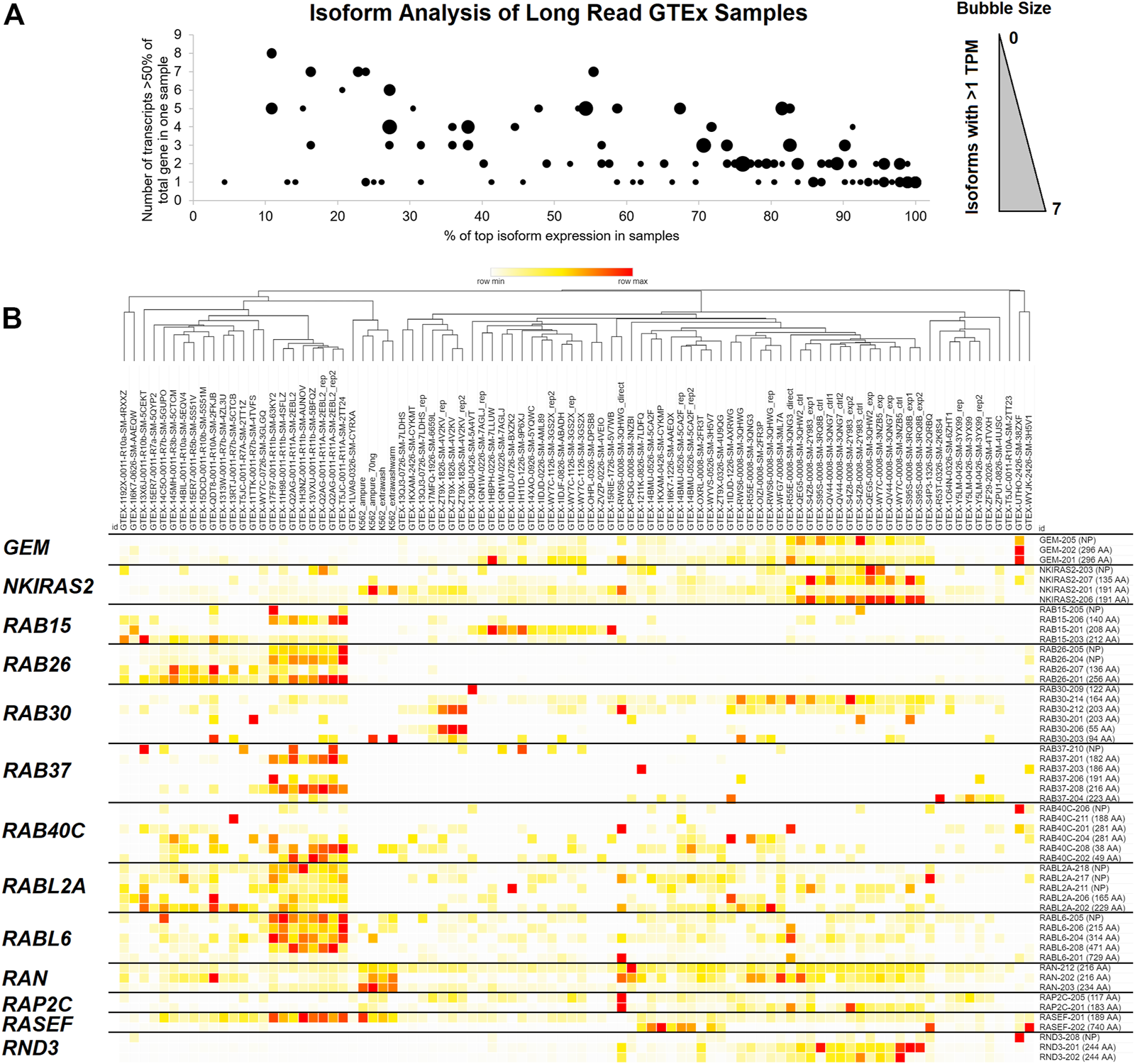 GTEx long-read sequencing data for small GTPase isoforms. (A) Analysis of the small GTPase genes for protein-coding isoform expression in Nanopore-based long-read sequencing, where each spot corresponds to one small GTPase gene. The x-axis shows each gene’s average % expression of the top expressed isoform. The y-axis shows the number of transcripts greater than 50% of a gene expression in any sample. The dot size corresponds to the number of protein-coding isoforms within a gene with an average greater than one transcript per million sequences (TPM). Values with zero are not shown, and the maximum number of isoforms is seven within one gene. (B) Heat map of Nanopore-based long read samples of GTEx for several genes that have expressed multiple isoforms. The top shows each Nanopore sample listed as a column with a dendrogram generated as one minus Spearman’s rank correlation. The right shows isoforms for each row. Coloring is based on the z-score for each gene across all samples, with the middle level in yellow and the highest in red.