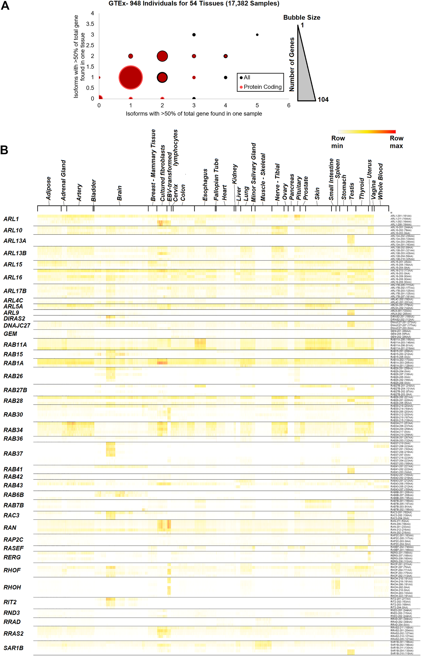 GTEx tissue-specific data for small GTPase isoforms. (A) The number of isoforms across samples and tissues. The x-axis shows the number of isoforms that account for at least 50% of the gene expression in one sample, while the y-axis shows the number of isoforms that account for at least 50% of the gene expression in one tissue. The bubble size represents the number of isoforms at each x and y level, with a maximum of 104. The red spots represent protein-coding transcripts, and the black spots all transcripts. (B) Heat map of transcript expression for several small GTPase genes with more than one isoform expressed across tissues. Sample tissues are labeled on the top and isoforms for each gene on the right. Coloring is based on the z-score for each gene, with the middle level in yellow and the highest in red.