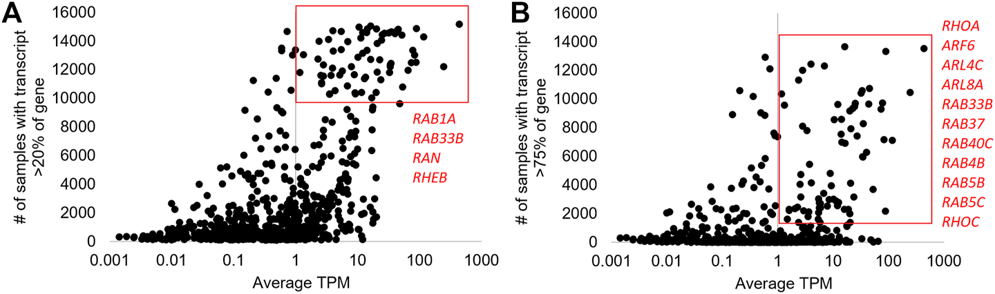 “Blood PAXgene” based changes in small GTPase isoforms. (A) The Analysis of 16,243 samples from 116 NCBI BioProjects for isoforms of small GTPase genes. The x-axis shows the average transcripts per million (TPM) for each isoform, and the y-axis shows the number of samples where that isoform is greater than 20% of the total gene expression. The red box is around those isoforms with >10,000 samples and one TPM; the four genes with more than one isoform are labeled in red. (B) The same plot in (A) shows the y-axis for samples greater than 75%. The red box is around those with >2,000 samples and 1 TPM, with the 11 genes having >1 isoform in the box labeled in red.