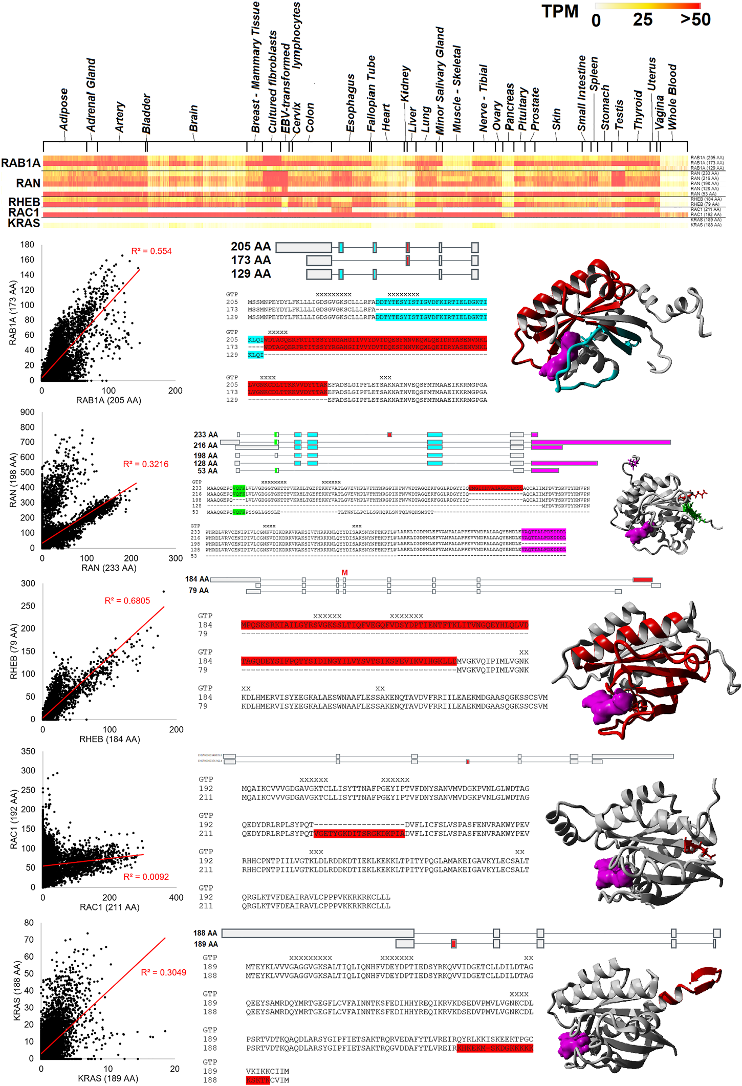 Small GTPase splicing differences seen in many tissues. The top panel shows a heat map of RAB1A, RAN, RHEB, RAC1, and KRAS isoforms for GTEx tissues. Color is based on transcripts per million (TPM) values, where yellow is 25 TPM and red is >50 TPM. Below the heat map are details for each of the five genes. The left panel shows the values of the top protein isoforms in the 16,243 “Blood PAXgene” samples, where the x and y axes show different isoform values. The red line represents the best fit line with an R-squared correlation shown in red. The middle shows the isoform map and sequence alignment with variable regions identified with colors. On the far right is the protein model, with colors similar to the alignment and GTP/GDP in magenta.