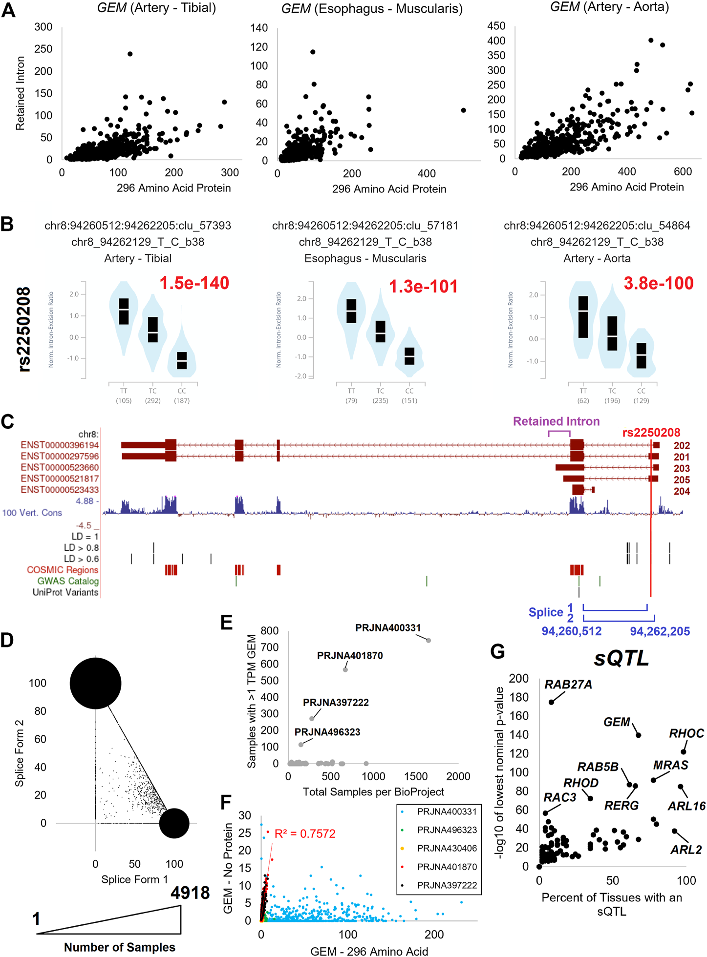 GEM isoform dynamics. (A) The expression in transcripts per million (TPM) of GEM 296 AA isoform (x-axis) relative to retained intron transcripts (y-axis) for tibial artery, muscularis esophagus, and aorta artery. (B) GTEx annotated splicing quantitative trait loci (sQTLs) for GEM based on rs2250208 variant for each of the three tissues in panel (A). TT and CC are homozygous splicing levels, and TC those individuals heterozygous. The GTEx annotated p-value is labeled in red. (C) Exon map of GEN showing the location of retained intron (magenta), rs2250208 (red), and the splicing sites (blue). Labeled below the exon map are various annotated genomic features, including rs2250208-based linkage disequilibrium (LD) variants, catalog of somatic mutations (COSMIC) variants, Genome-Wide Association Study variants (GWAS), and UniProt variants. (D) Expression of the two splice forms in “Blood PAXgene” samples. The x-axis is the percent of transcripts using splice form 1, and the y-axis is the splice form 2. The size of the spot corresponds to the number of samples with values. (E) Compiled analysis of the expression of GEM transcripts in different BioProjects. (F) Expression analysis of GEM protein-coding isoforms relative to retained intron transcripts for the BioProjects identified in (E). (G) Extraction of GTEx annotated sQTLs for small GTPase genes. The x-axis shows the percent of tissues with an eQTL for the given gene, and the y-axis shows the lowest nominal p-value from GTEx analysis across those tissues.