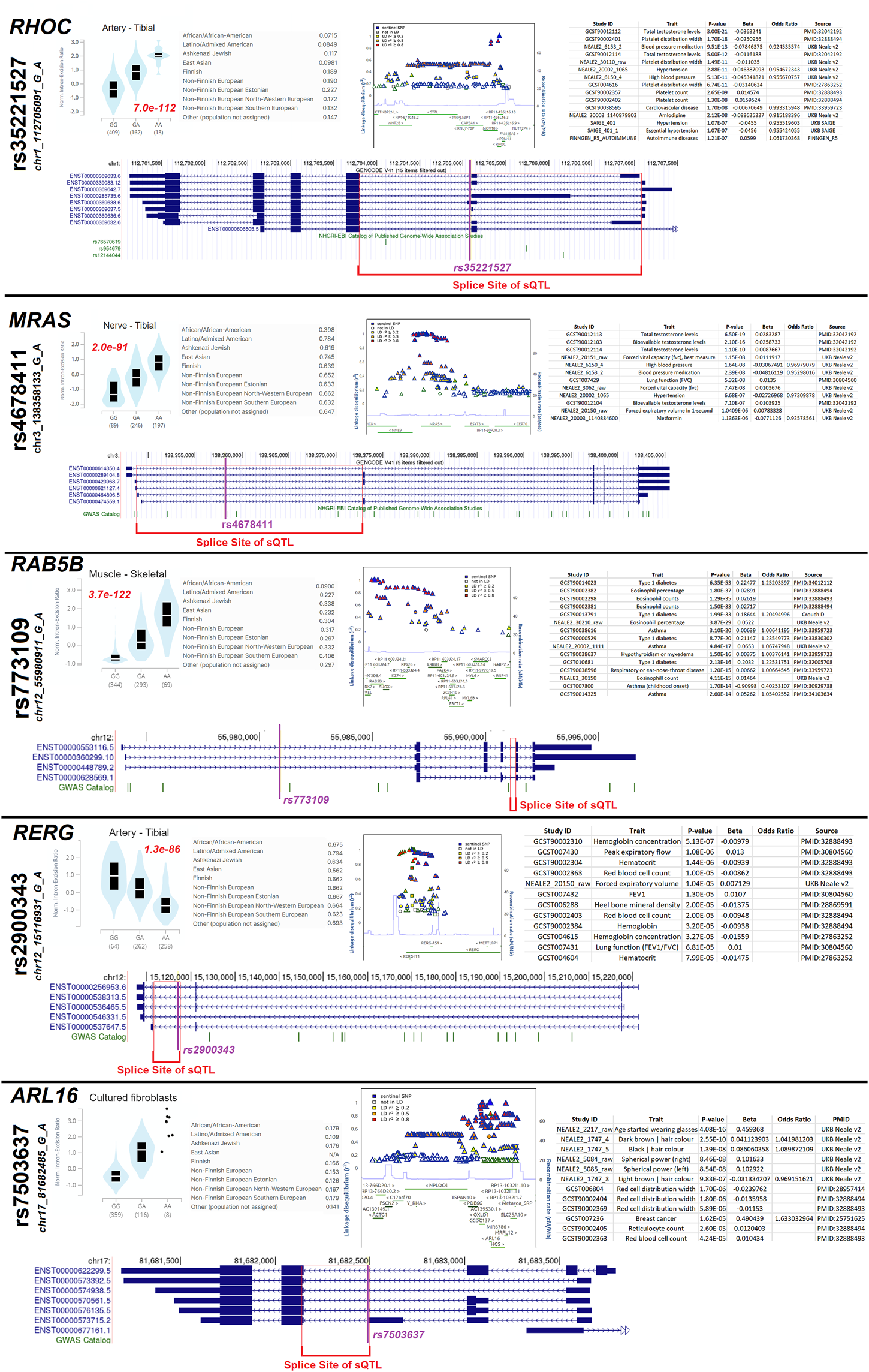 The variant rs35221527 has an sQTL for RHOC, with the tibial artery having the most significant p-value (7e-112), which is found with the highest frequency in non-Finnish Europeans with only a few variants in linkage disequilibrium (LD). The variant found in the middle of the splice sites of the sQTL is significantly associated with total testosterone levels, platelet distribution width, and blood pressure/hypertension. The variant rs4678411 is an sQTL for MRAS with the most significant p-value in the tibial nerve (2e-91), which is found throughout all populations and has many variants in LD. The variant is also found in the middle of the splice site of the sQTL and is associated with testosterone levels and blood pressure. The variant rs773109 is an sQTL for RAB5B with the most significance in skeletal muscle (3.7e-122), which is found with the highest allele frequency in non-Finnish southern Europeans with many variants in LD. The lead variant is far from the splice site of the sQTL, suggesting a potential LD variant of function for traits including Type-1 diabetes and eosinophil percentage. The variant rs2900343 is associated with an sQTL in RERG that is most significant in the tibial artery (1.3e-86) and found throughout all populations with a complex LD block. The lead SNP falls at the predicted splice site and is associated with hemoglobin concentration. Finally, the variant rs7503637 is associated with an sQTL for ARL16 that is found in most populations with a complex LD block. The lead SNP is located at the predicted splice site of the sQTL and is associated with wearing glasses and hair color. This suggests that genetic variants influencing small GTPase splicing, whether common or rare, can be associated with altered human biology and potentially disease.
