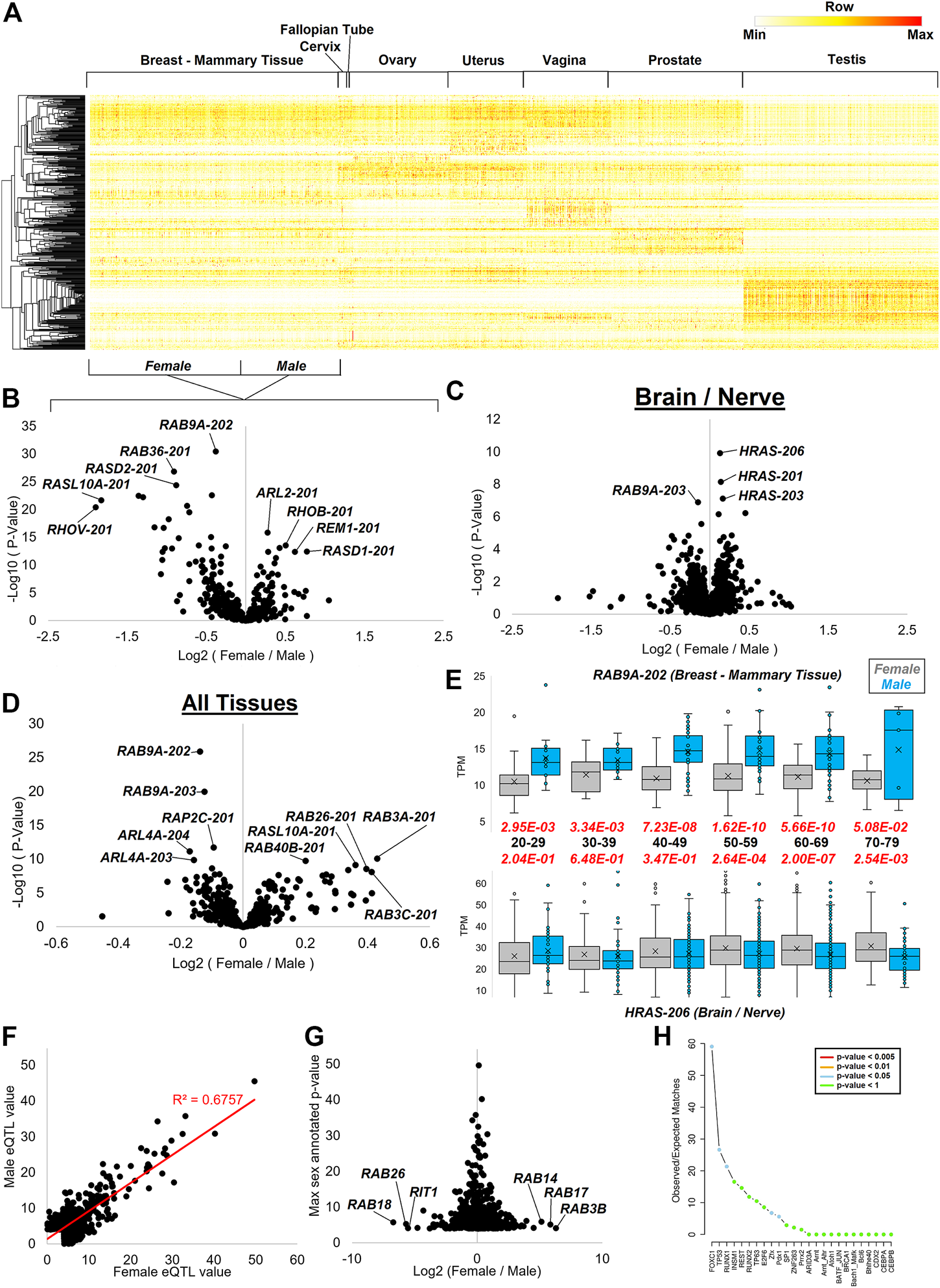 Splicing dynamics within reproductive datasets and sex differences. (A) Heat map of all small GTPase isoforms for tissues with sex differences in GTEx. Mammary breast tissue is the only one with both male and female data marked on the bottom for the grouping. Coloring is based on the z-score for each gene, with the middle level in yellow and the highest in red. (B–D) Volcano plot with the log2 fold change of female vs. males (x-axis) relative to the -log10 p-value of female vs. male (y-axis) shown for mammary breast tissue (B), multiple brain and neural datasets (C), and all tissues (D) of GTEx. (E) Representative box and whisker plot of two transcripts showing sex differences at various ages. The top shows the RAB9A-202 transcript, and the bottom shows HRAS-206 isoform. The black text in the middle is the age group with the red text the p-value of female (gray) vs. male (cyan). (F) GTEx annotated sex-based expression quantitative trait loci (sbeQTLs) for small GTPase genes, showing the female −log10 p-values on the x-axis and male values on the y-axis. The red line shows the best fit line and R-squared correlation. (G) The log2 fold change of female vs. male p-values (x-axis) from panel F relative to the top annotated p-value. (H) SNP2TFBS analysis of the top variant with >2 and <−2 fold change in (G), showing the enrichment of transcription factor binding sites in the SNPs identified.