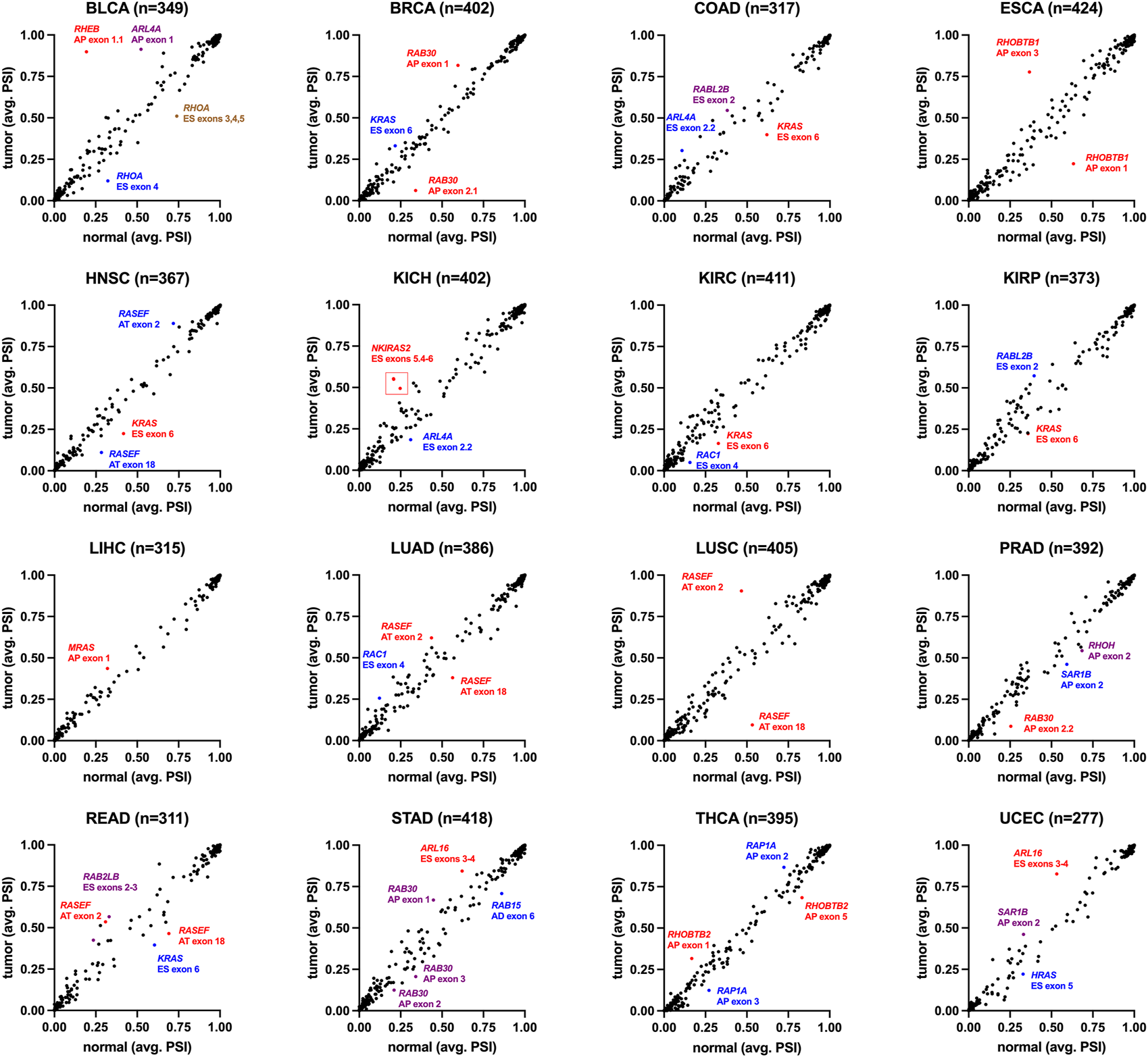 Small GTPase splicing dynamics in human cancer. Percent-spliced-in (PSI) values are the normalized read counts for inclusion of the splicing event over the normalized total (inclusion and exclusion) read counts for that event. The small GTPase splice isoforms were selected, and their PSI values averaged for all normal (x-axis) and tumor tissue (y-axis) within the indicated cancer types: BLCA-bladder urothelial carcinoma (19 cases/416 controls), BRCA-invasive breast carcinoma (113/1104), COAD-colon adenocarcinoma (41/467), ESCA-esophageal carcinoma (13/190), HNSC- head and neck squamous cell carcinoma (43/511), KICH- kidney chromophobe (25/76), KIRC- kidney renal clear cell carcinoma (72/543), KIRP- kidney renal papillary cell carcinoma (32/300), LIHC- liver hepatocellular carcinoma (50/381), LUAD-lung adenocarcinoma (59/524), LUSC- lung squamous cell carcinoma (49/511), PRAD-prostate adenocarcinoma (52/507), READ-rectum adenocarcinoma (10/176), STAD-stomach adenocarcinoma (37/425), THCA-thyroid carcinoma (71/527), UCEC- uterine corpus endometrial carcinoma (35/555). Listed for each cancer type is the number of isoforms in small GTPases (n). Select splice isoforms are indicated by gene, exon(s), and type of event (AP, alternate promoter; AT, alternate terminator; ES, exon skip).