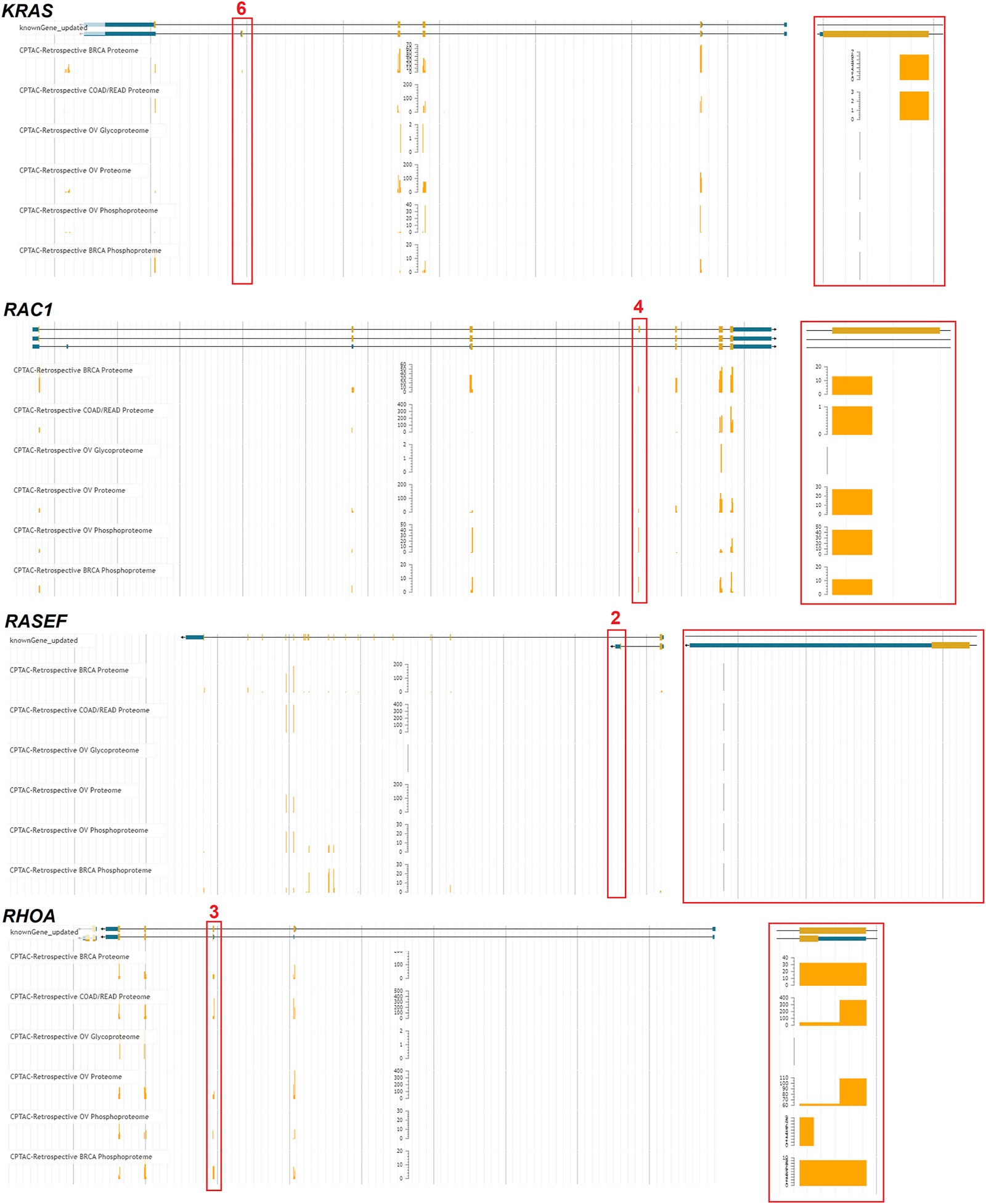 Proteomic analysis of exon skipping in cancer samples. Four genes (KRAS, RAC1, RASEF, RHOA) with identified exon skipping were processed through the TCGA peptide genome mapping tool (https://pdc.cancer.gov/jbrowse/). Exons noted in Figure 13 were marked in red, with a zoom in on that exon shown to the right. The yellow bars represent the amount of peptide mapped in six different proteomic datasets.