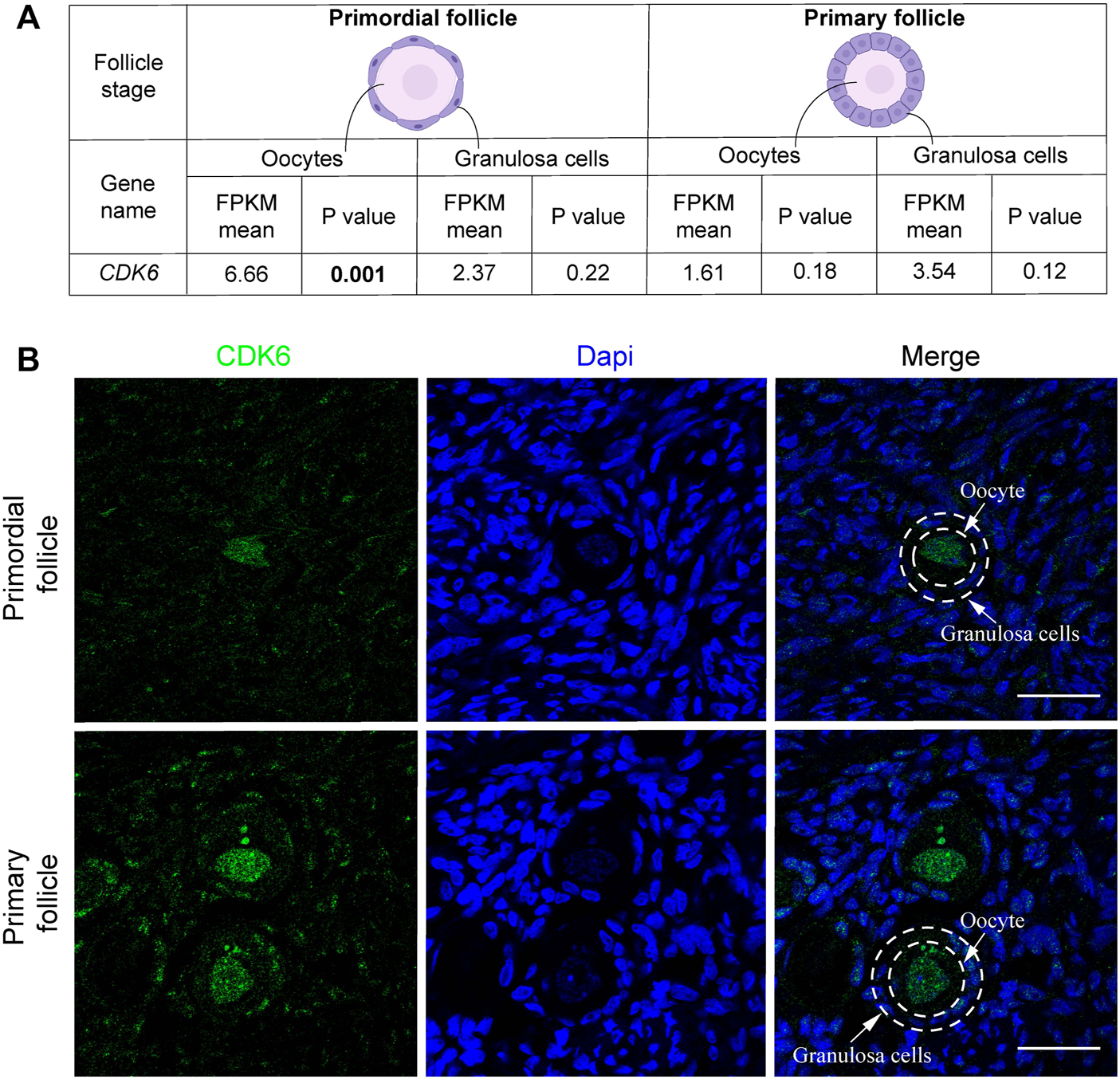 Previous data revealed that the CDK6 gene was expressed in human primordial and primary follicles, where transcriptional levels of CDK6 showed downregulation in oocytes and upregulation in granulosa cells, from primordial to primary follicle transition in human ovarian tissue (Ernst et al., 2017; Ernst et al., 2018).