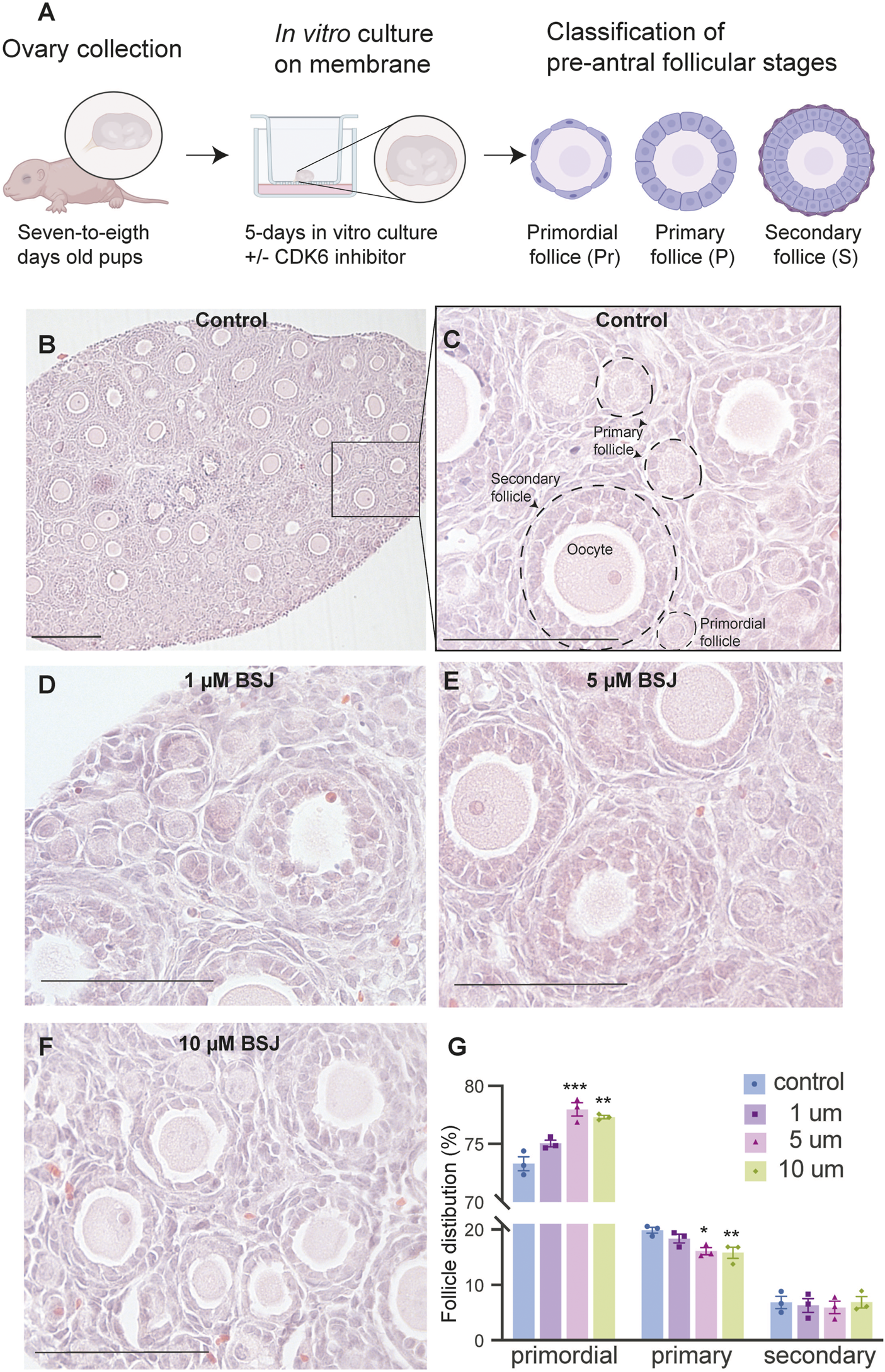 Inhibition of CDK6 suppress primordial follicle activation in vitro.(A) Schematic illustration of the experimental design and morphological characteristics of primordial (Pr), primary (P) and secondary (S) follicles. (B) Photomicrograph of whole ovary cultured 5 days in vitro in control medium. Scale bar: 100 µm. (C) The square defined in B is examined more closely to assess the follicular morphology, and follicular structures are defined. Scale bar: 50 µm. (D–F) Representative photomicrograph of H&E-stained ovary exposed to 1 µM BSJ (D), 5 µM BSJ (E), and 10 µM BSJ (F). Scalebar: 50 µm. Photomicrographs of whole ovaries and more representative sections of the ovary are shown in Supplementary Figure S2. (G) The distribution of primordial, primary and secondary follicles in ovaries exposed to 0–10 µM BSJ. Data are also represented in table 1 and includes 30–40 µM of BSJ, and photomicrographs of H&E-stained ovaries of these concentrations are shown in Supplementary Figure S2. For all concentration n = 3. The data is analyzed with one-way ANOVA followed by Bonferroni correction where the mean of each concentration is compared with the mean of the control. Statistically significant data are noted with asterisks, *p < .05, **p < .01, ***p < .001, ****p < .0001.