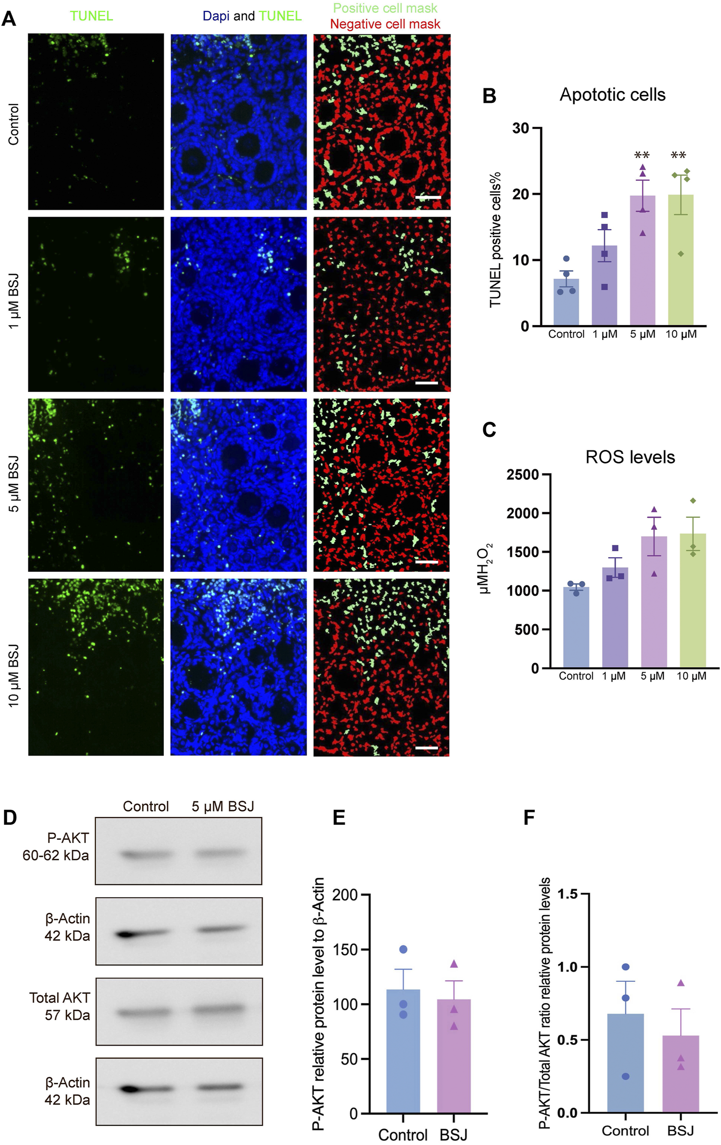 TUNEL and ROS quantification of ovaries cultured with different concentrations of BSJ (0–10 µM) in vitro for 5 days. (A) The number of apoptotic cells were detected with TUNEL staining. Row 1: TUNEL stain, Row 2: Merge of TUNEL and DAPI stain, row 3: Analysis of apoptosis quantification using an automated cell imaging system. Green cell mask represents cell positive for TUNEL stain, whereas red cell mask represents viable cell mask. Negative controls are represented in Supplementary Figure S1. (B) Quantification of percentage of cells positive for TUNEL stain. For all groups n = 4. (C) Quantification of ROS levels in ovaries in vitro cultured for 5 days with different concentration of (0–10 µM) BSJ. For all groups n = 6. (B,C) Data are analyzed with one-way ANOVA followed by Bonferroni correction where the mean of each concentration is compared with the mean of the control. Statistically significant data are noted with asterisks, *p < .05, **p < 0.01. (D) Representative Western blotting with primary antibodies against Phospho-AKT, AKT and beta-actin as loading control on ovaries in vitro cultured with 0 and 5 µM BSJ for 5 days. Full-length membranes are represented in Supplementary Figure S4. Data reflects three independent biological replicates, n = 12 in each group, and are represented as mean ± SEM. Data are analyzed with a two-tailed t-test.