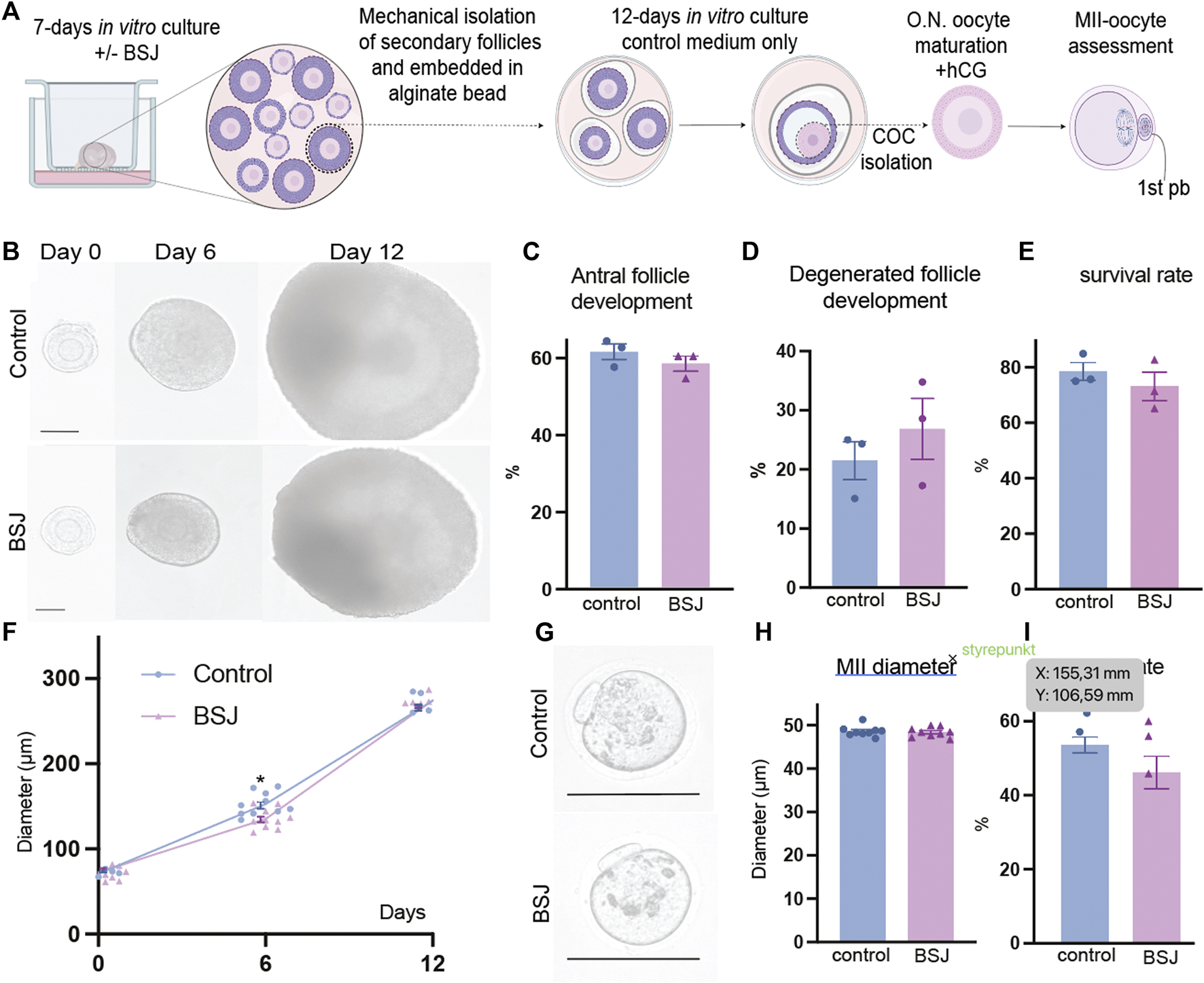 Methods: In mouse ovarian in vitro culture, BSJ reduced the activation of primordial follicles, and reduced follicle development. As a next step, we examined the egg maturation read-out and found that BSJ-treated follicles matured to competent MII eggs with resumption of first meiosis, comparable with the control group.