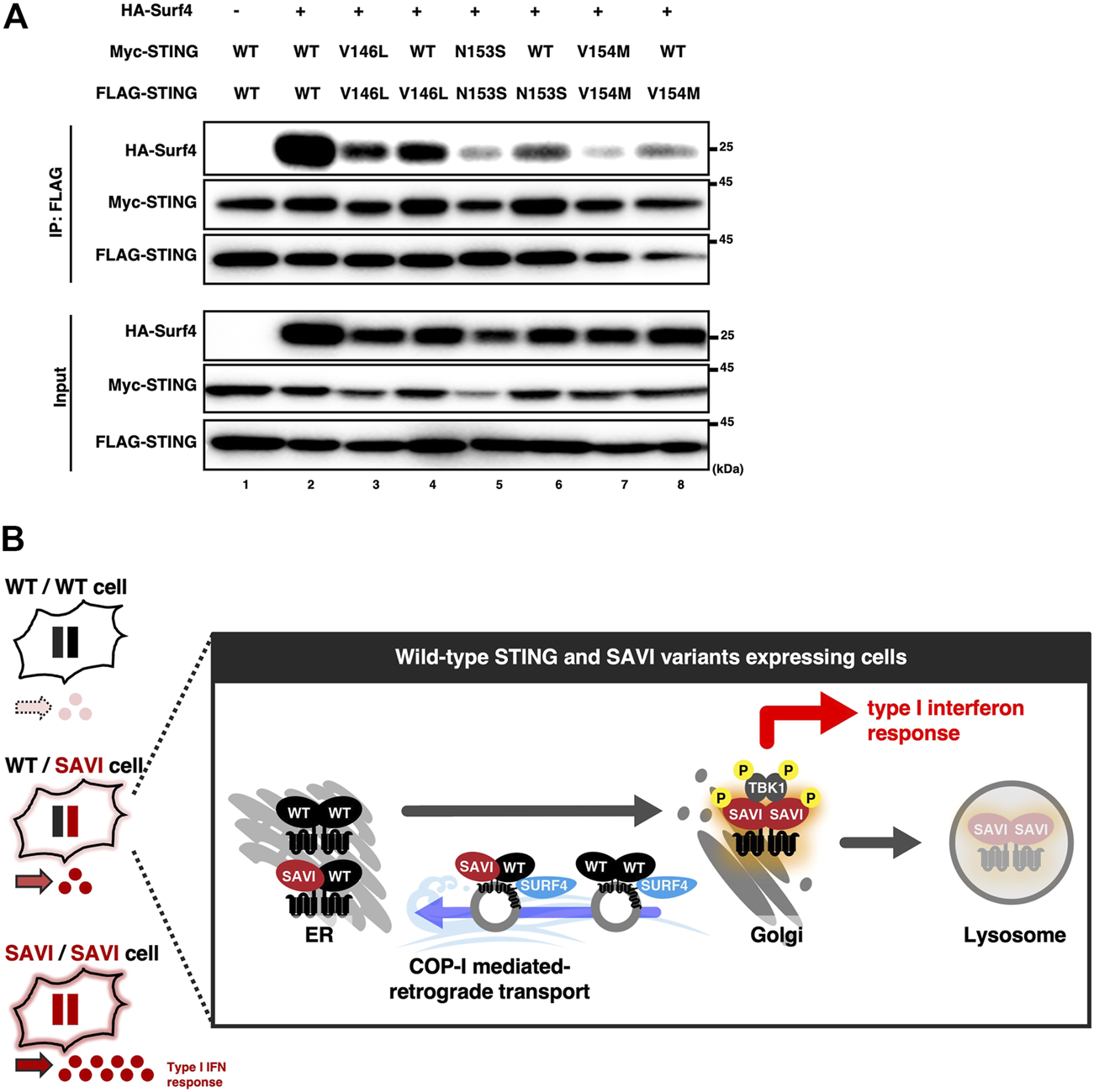 The expression of WT increased the binding between SURF4 and SAVI. (A) HEK293T cells were transfected with the plasmids as indicated. Cell lysates were prepared, and FLAG-STING was immunoprecipitated with anti-FLAG beads. The cell lysates and the immunoprecipitated proteins were analyzed by western blot. (B) A graphical abstract illustrating the three types of STING complex with their subcellular localizations.