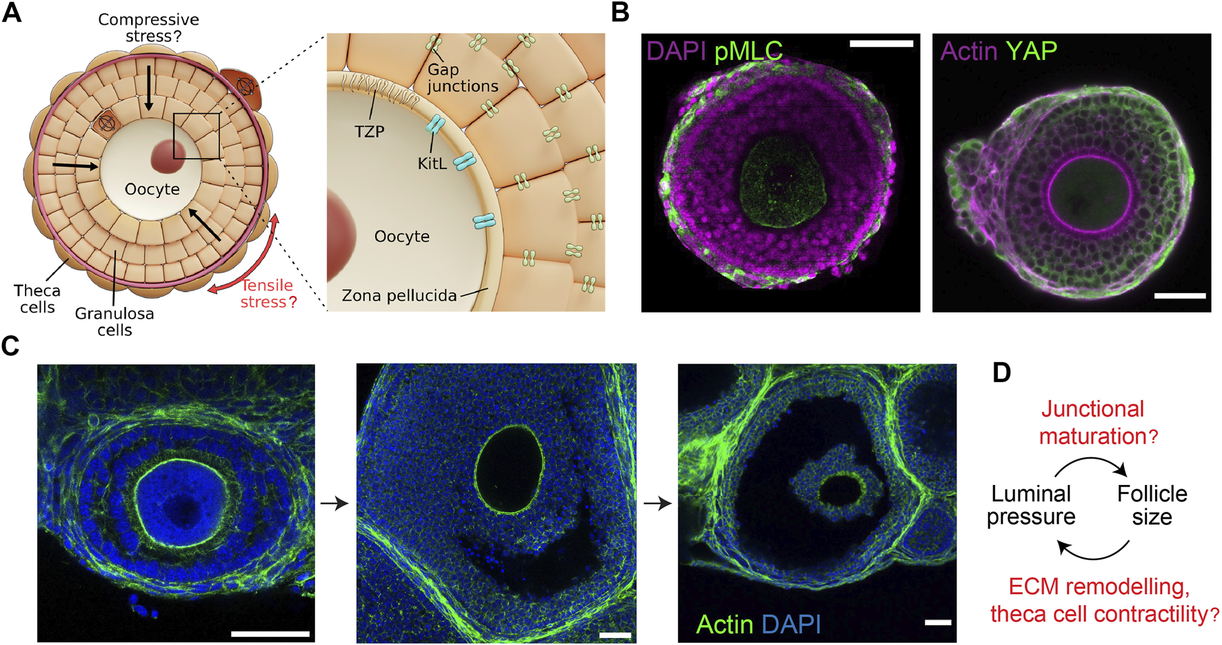 Mechano-hydraulic control of secondary and antral follicle development. (A). During secondary follicle development, spindle-shaped TCs form around the basement membrane (dark red) and the GCs, potentially generating compressive stress within the follicle. Anisotropic stress pattern may guide cell division orientation in the TCs (circumferential) and the GCs (radial). Inset: Compressive stress may affect oocyte growth by modifying the oocyte-granulosa interactions mediated by the TZP and Kit ligands. Mechanical stress may also influence the GC proliferation via gap junction activities. (B). Left: Isolated follicle immuno-stained for nuclei (DAPI) and phosphorylated-myosin light chain (pMLC), showing contractile TCs. Right: Follicle immuno-stained for actin and YAP, showing YAP nuclear localisation in the TCs only. Scale bar: 50 µm. (C). Antral follicles immuno-stained for nuclei (DAPI) and actin. Luminal fluid accumulates at the intercellular space, eventually merging into a singly-resolved antrum that continues to expand till ovulation. Scale bar: 40 µm. (D). Potential feedback loop between luminal pressure and follicle size: increased luminal pressure may trigger junctional maturation and follicle expansion through mechanosensing, while TC stiffening may control the final size of the follicles.
