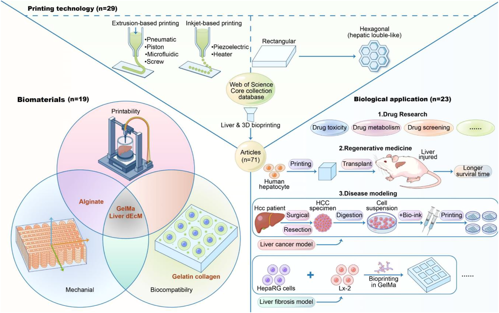 Among the screened liver-related 3D bioprinting articles, the biological application aspects can be mainly divided into drug research, regenerative medicine, and disease modeling.