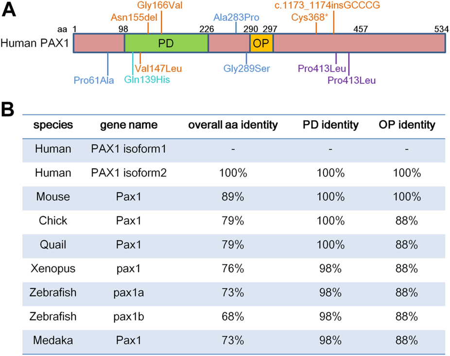 PAX1 is a highly conserved transcription factor. (A) Schematic representation of human PAX1 protein domains. It contains a highly conserved paired-box domain (PD) and an octopeptide domain (OP). Amino acid (aa) positions are indicated above. Locations of PAX1 mutations identified in human diseases are also marked. (B) Identity in the overall amino acid sequence, PD and OP domains between human PAX1 and PAX1 proteins from other species in National Center for Biotechnology Information (NCBI) database. PAX1 Protein sequence reference number in NCBI: Human isoform 1 (NP_006183.2); isoform 2 (NP_001244025.1); Chick (NP_001383596.1); Quail (XP_015705637.2); Xenopus (XP_002939483.2); Zebrafish Pax1a (NP_001074061.1); Zebrafish Pax1b (XP_700877.6); Medaka (NP_001165520.1).