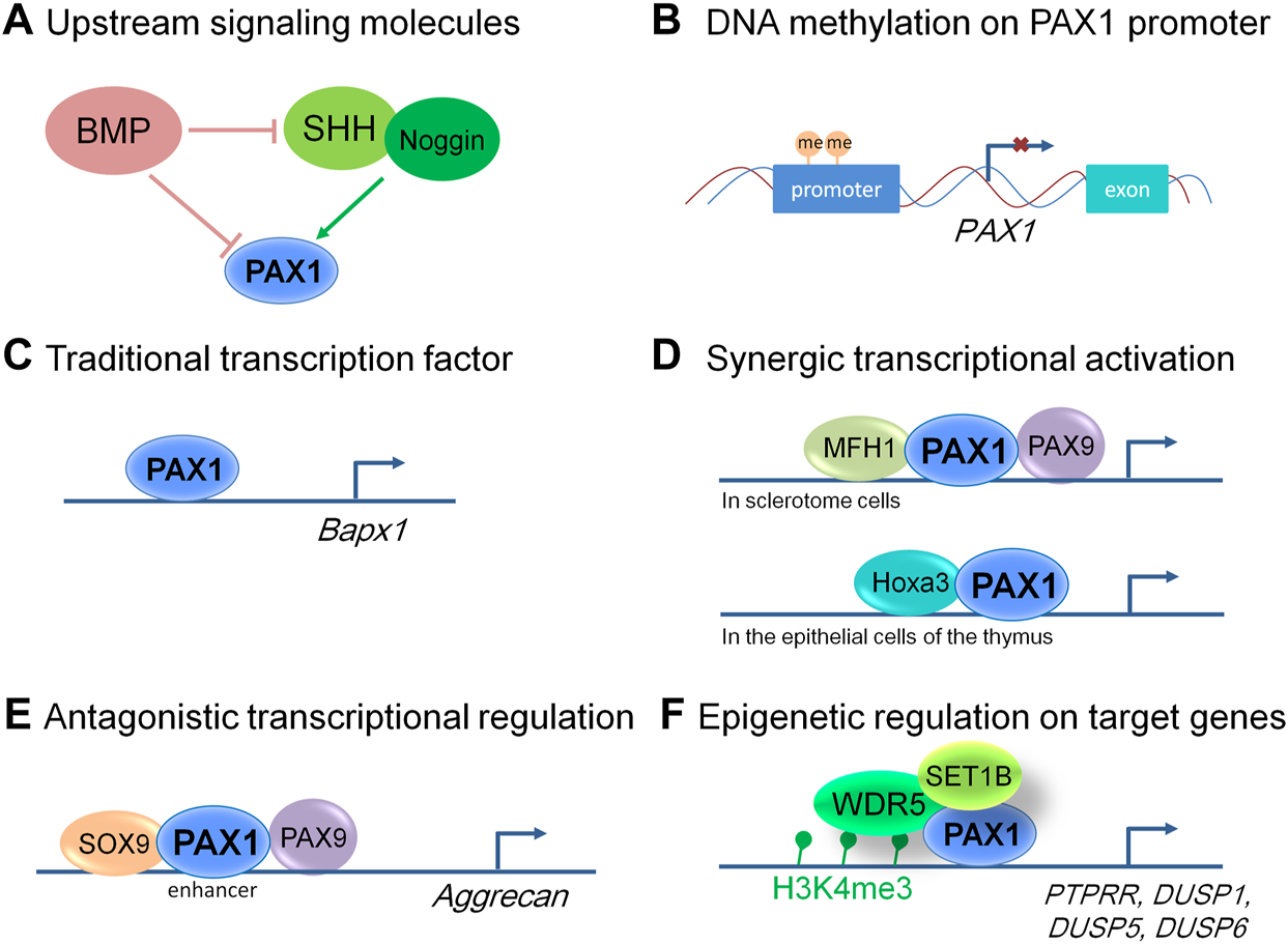 FIGURE 2. Molecular modes of action of PAX1 and its up and downstream events. (A) Signaling molecules function upstream of PAX1 in embryonic development. (B) PAX1 is hypermethylated at its promoter region in many kinds of cancer cells, leading to decreased level of PAX1 expression. (C) PAX1 can function as a traditional transcription factor to transactivate regulatory sequences in the Bapx1 promoter region in sclerotome cells. (D) PAX1 acts on cell proliferation synergistically with MFH1 and PAX9 in sclerotome cells and Hoxa3 in the epithelial cells of the thymus. (E) PAX1 and PAX9 play antagonistic roles with SOX9 in the enhancer region of Aggrecan in the developing vertebral column. (F) PAX1 forms a complex with WDR5 and SET1B to regulate the H3K4me3 level within the promoters of PTPRR, DUSP1, DUSP5, and DUSP6.
