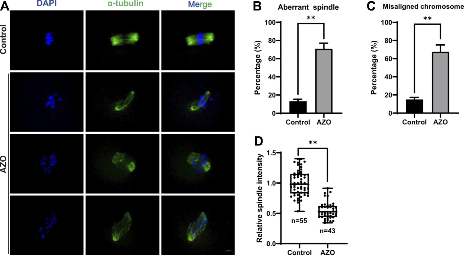 AZO treatment impairs alignment of chromosomes and organization of spindles in oocytes. (A) Representative images showing spindle morphologies and chromosome alignment in AZO-treated oocytes and control oocytes. The MI stage oocytes were stained with α-Tubulin antibody and DAPI to visualize spindle and chromosomes, respectively. Scale bar, 10 μm. (B) The aberrant spindle rate was evident in the control and AZO-treated oocytes at MI stage. (C) The aberrant misaligned chromosome was evident in control and AZO-treated oocytes at MI stage. (D) Quantification of spindle intensity in control and AZO-treated oocytes at MI stage. Data are expressed as mean ± SEM. **p < 0.01.