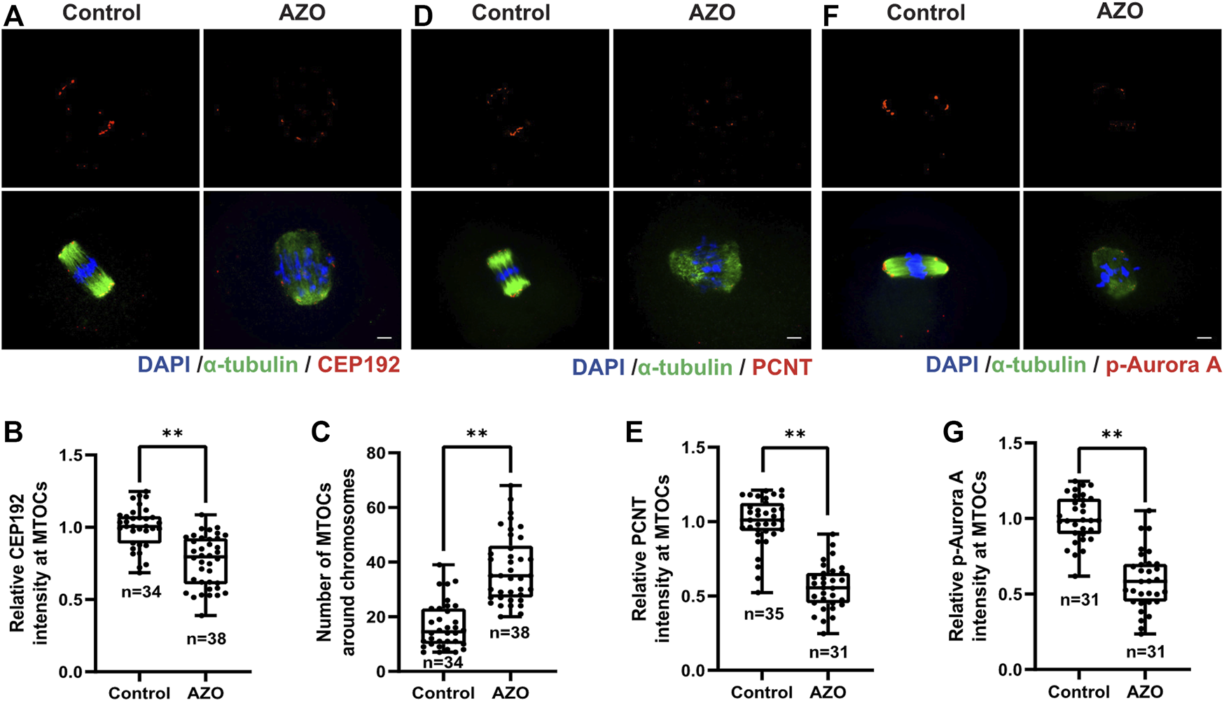 AZO exposure impairs acentriolar MTOC assembly during meiotic maturation. Oocytes were cultured with 5 μM AZO for 8 h and stained with the indicated antibodies and DAPI. (A,D,F) Representative images of oocytes labeled with α-Tubulin, CEP192, PCNT, and p-Aurora antibodies. (A). Scale bar, 10 μm. (B,E,G) The intensities of CEP192, PCNT, and p-Aurora A around MTOCs are quantified. (C) The number of MTOCs around chromosomes is quantified using CEP192 fluorescent foci. All data are expressed as mean ± SEM. **p < 0.01.