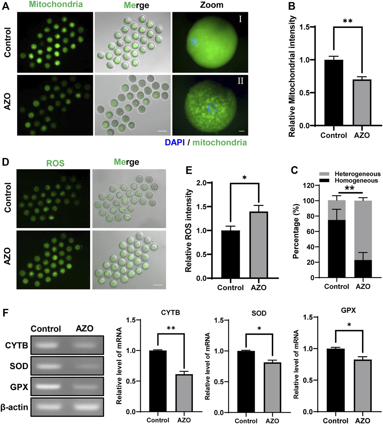 AZO impairs mitochondrial distribution and increases ROS levels. Mitochondria were stained with Mitotracker after 8 h of culture with DMSO (Control) or AZO. (A) Representative images of live oocytes stained with Mitotracker. Scale bar, 100 μm (white). Enlarged images of oocyte with homogeneous distribution in the control group and oocyte with heterogeneous distribution in the AZO group. Scale bar, 10 μm (yellow). (B) Mitochondrial intensity of oocytes in control and AZO groups is determined. (C) Percentage of oocytes with homogeneous or heterogeneous mitochondrial distribution. (D) Representative images of live oocytes stained with DHR-123. Scale bar, 100 μm. (E) The fluorescent intensity of ROS in control and AZO-treated oocytes. (F) Relative mRNA expression of CYTB, SOD, and GPX in control and AZO-treated oocytes. Data are expressed as mean ± SEM from five independent experiments except panel (F). Data in panel (F) derived from two independent experiments. *p < 0.05, **p < 0.01.