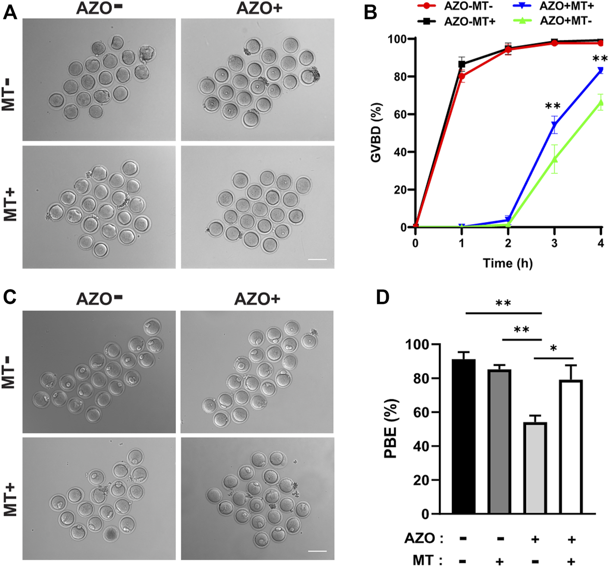Melatonin rescues PBE impaired by AZO exposure. Oocytes were matured in the absence (−) or presence (+) of AZO and melatonin (MT) during meiotic maturation. (A) Representative images of oocytes at 4 h of culture with different treatments following IBMX release. Scale bar, 100 μm. (B) The percentage of GVBD is expressed as mean ± SEM from two independent experiments. (C) Representative images of oocytes at 16 h of culture with different treatments following IBMX release. Scale bar, 100 μm. (D) After 16 h of culture with different treatments, the percentage of polar body extrusion was expressed as mean ± SEM from three independent experiments. *p < 0.05, **p < 0.01.