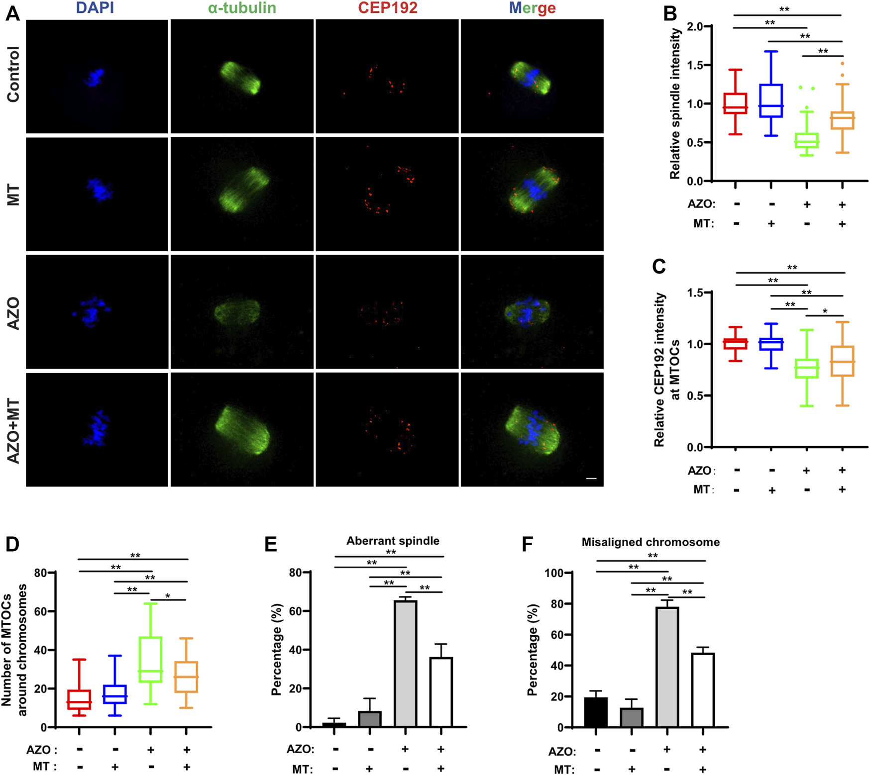 Melatonin rescues AZO-induced impairment of spindle assembly. Oocytes were cultured for 8 h in the absence (−) or presence (+) of AZO and melatonin (MT) during meiotic maturation. (A) Representative images of oocytes labeled with α-Tubulin and CEP192. Scale bar, 10 μm. (B,C) The intensities of spindle and CEP192 around MTOCs are quantified. (D) The number of MTOCs around chromosomes is quantified using CEP192 fluorescent foci. (E) The aberrant spindle rate was evident in the control and AZO-treated oocytes at MI stage. (F) The aberrant misaligned chromosome was evident in control and AZO-treated oocytes at MI stage. All data are expressed as mean ± SEM. *p < 0.05, **p < 0.01.