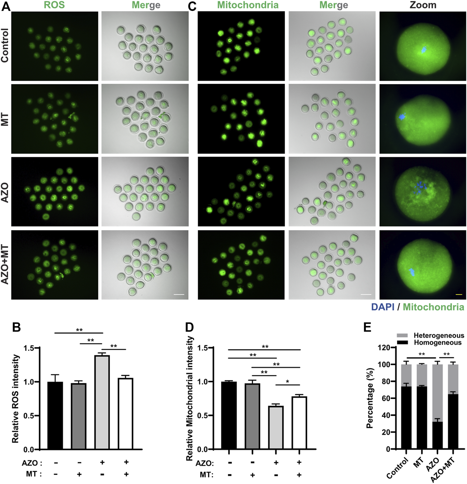 DHR123 (D1054, Sigma) was diluted to create a 20 mM stock solution and used at dilutions of 0.1% in M2 medium. Oocytes treated with AZO, MT, or AZO with MT were cultured for 8 h to allow MI progression or for 16 h to allow progression through MII. After washing with M2 medium three times, oocytes were incubated with 20 μM dihydrohodamine-123 (DHR123, D1054, Sigma Aldrich) in M2 medium for 30 min at 37°C in a 5% CO2 atmosphere. After washing three times, oocytes were counterstained with DAPI and mounted on glass slides. Oocytes were then observed under a Nikon Eclipse Ti inverted microscope, (Nikon), and the fluorescence was quantified using ImageJ software (National Institutes of Health, NIH).