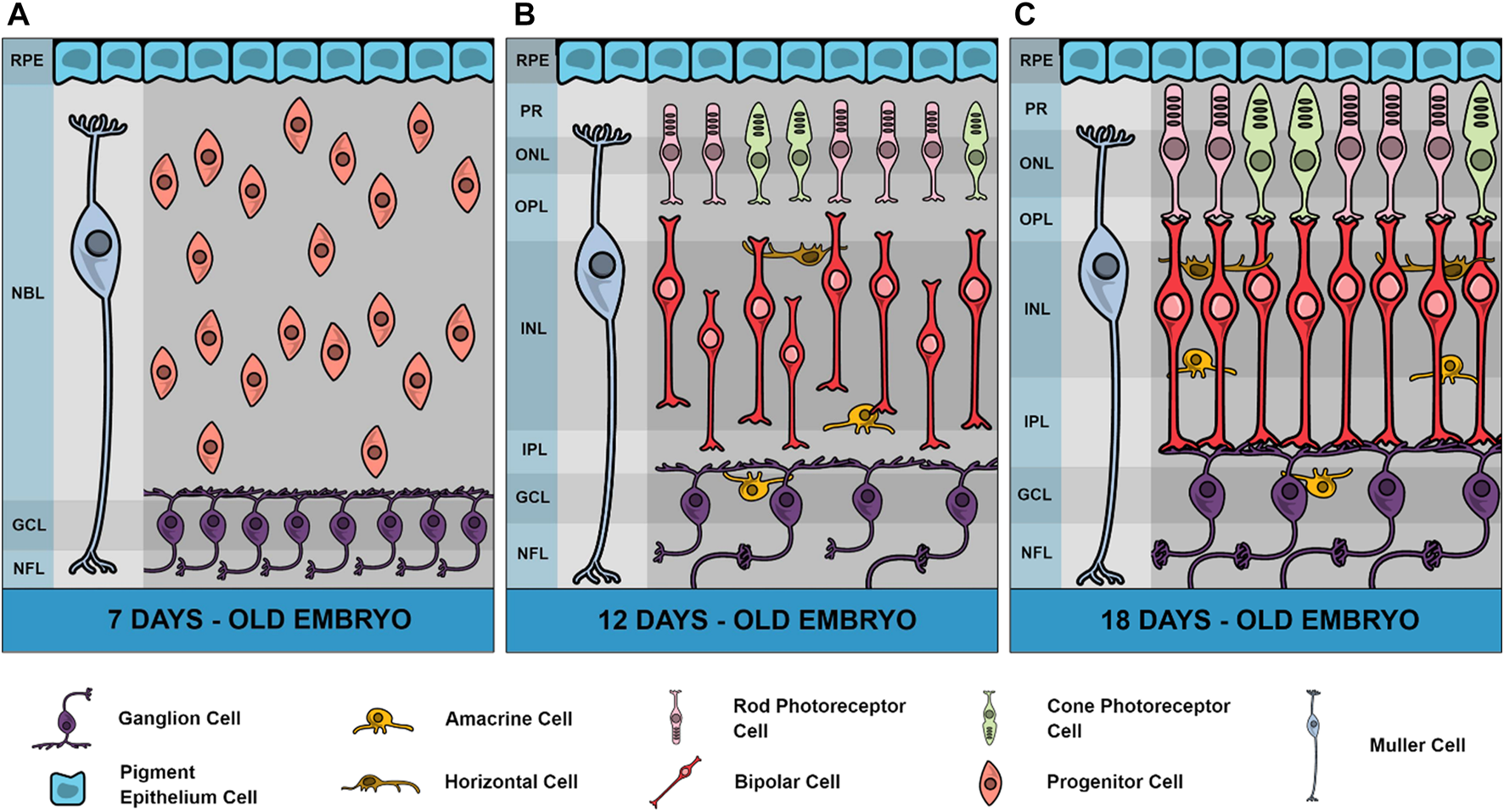The retina is a part of the Central Nervous System (CNS) involved in receiving, transducing, and modulating the light signals from the environment. The chicken retina is a very suitable model system for the study of CNS development since it can be easily obtained during most part of embryonic development and its histogenesis is relatively well known (Adler, 2000). Although few classes of cells are anatomically discernible, the chick retina differentiates more than a hundred cell types, as recently described using single cell transcriptomics, distributed among the six classes conserved across vertebrates (Yamagata et al., 2021), including photoreceptors, bipolar and ganglion cells comprising the vertical pathway, and horizontal and amacrine cells responsible for the horizontal modulation of neuronal activity. Moreover, a major glial cell type is the Muller cell which makes contact with neurons in the almost complete retinal extension (reviewed by Reichenbach and Bringmann, 2013). The chick retina is also a good model for studying nervous system development since it presents many of the neurotransmitters and neuromodulators present in the CNS (Calaza and Gardino, 2010). Figure 1 shows the general chick retina structure in three major periods of development, 7-day-old embryo (E7), E12 and E18. As can be observed, one important characteristic is the increase of plexiform layers where synaptic contacts, neurotransmitters and receptors are predominantly localized.